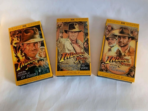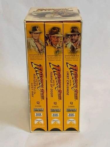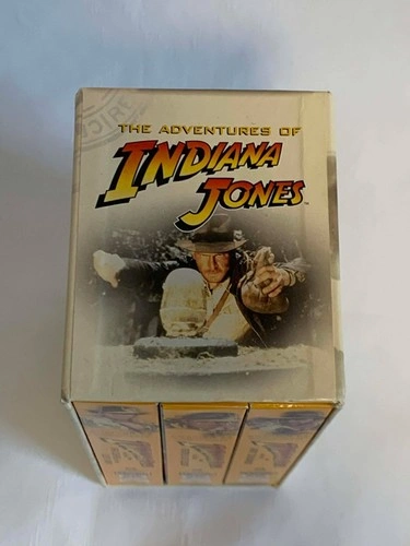 See photos for condition. The inner VHS tapes are in great shape. The outside shell has minor rips from stickers on one side, but is still in very nice shape. This is the complete The Adventures of Indiana Jones VHS box set featuring all three original films: Raiders of the Lost Ark, The Temple of Doom, and The Last Crusade. Each tape has been digitally remastered for THX sound and picture quality, ensuring a superior viewing experience. A perfect addition for any Indiana Jones fan or collector of vintage media. Key Features: Main Character(s): Indiana Jones (played by Harrison Ford), Publisher: Paramount / Lucasfilm, Universe: Indiana Jones Series, Release Year: Approx. 1990s, Cover Type: Sturdy cardboard box with individual VHS cases for each movie, Special Features: Digitally remastered for THX sound and image quality.