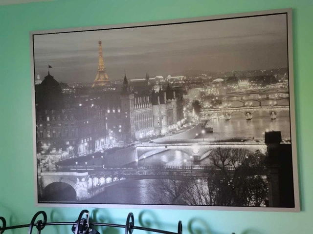 Add a touch of Parisian elegance to your space with this striking black and white canvas print of the iconic Paris skyline, complete with the Eiffel Tower, offering a sophisticated and timeless aesthetic to any room. This item is in used, but good condition.