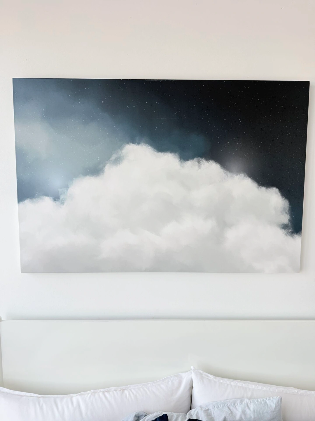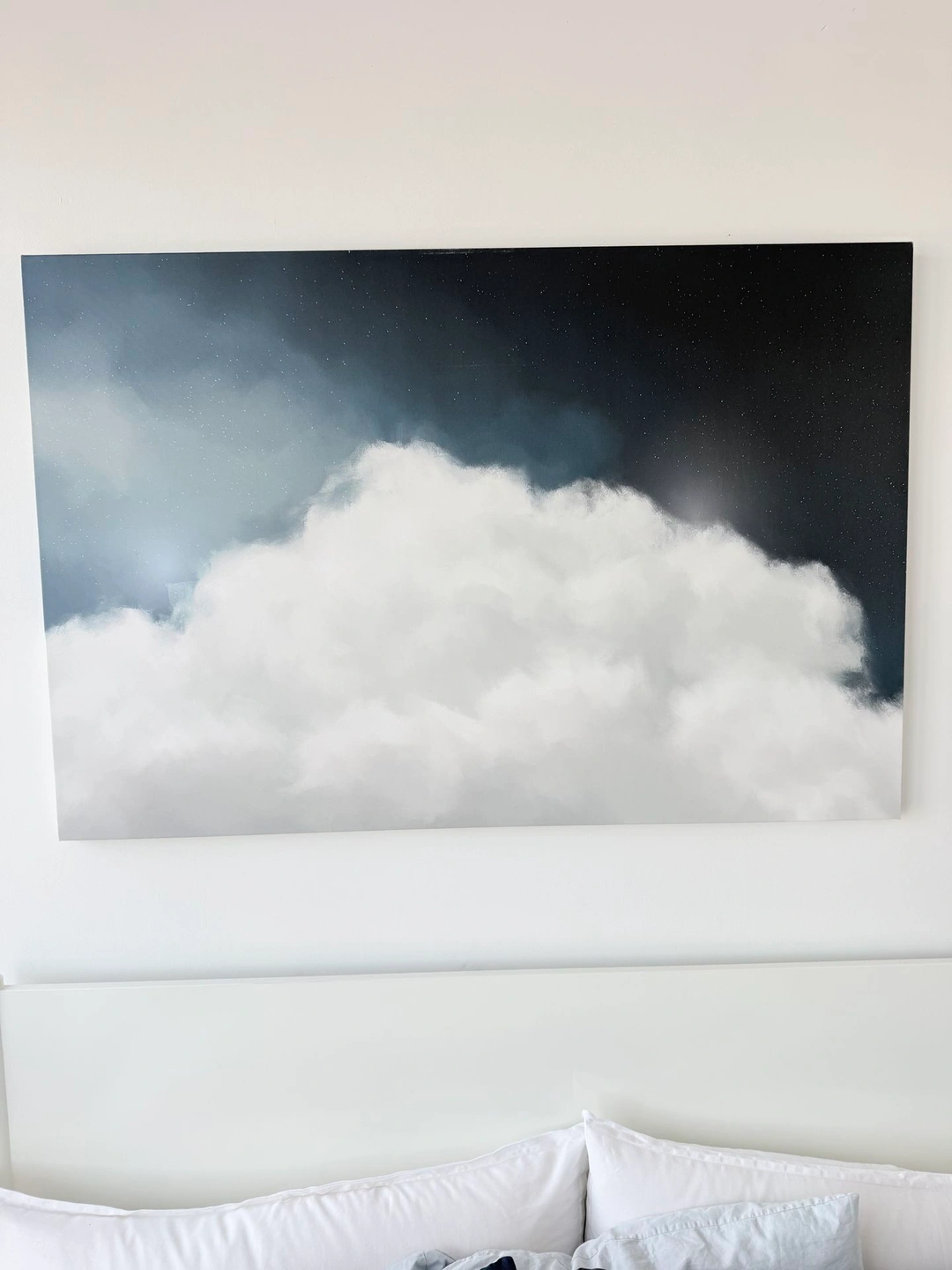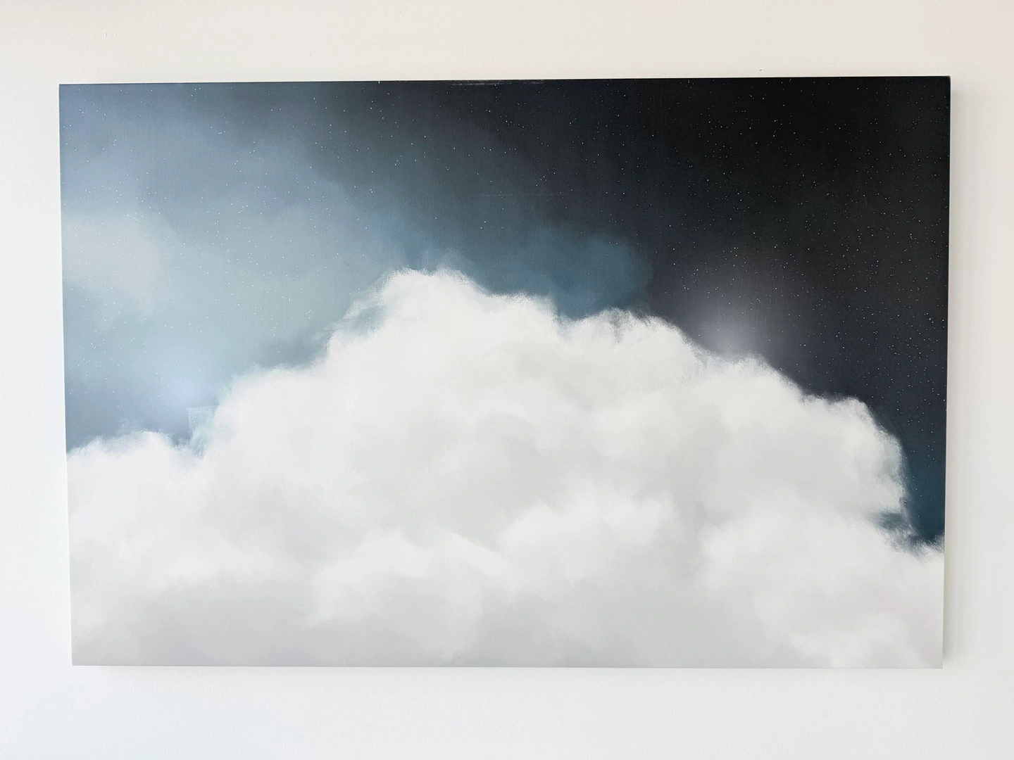 Large canvas print features a dreamy depiction of clouds against a starry night sky. It’s a beautiful piece that can add a serene touch to any room. The artwork is printed on canvas, ready to hang. Purchased directly from an artist via Etsy a few years ago. Dimensions: 32 in x 48 in. Pickup only; cash, Zelle or Venmo.