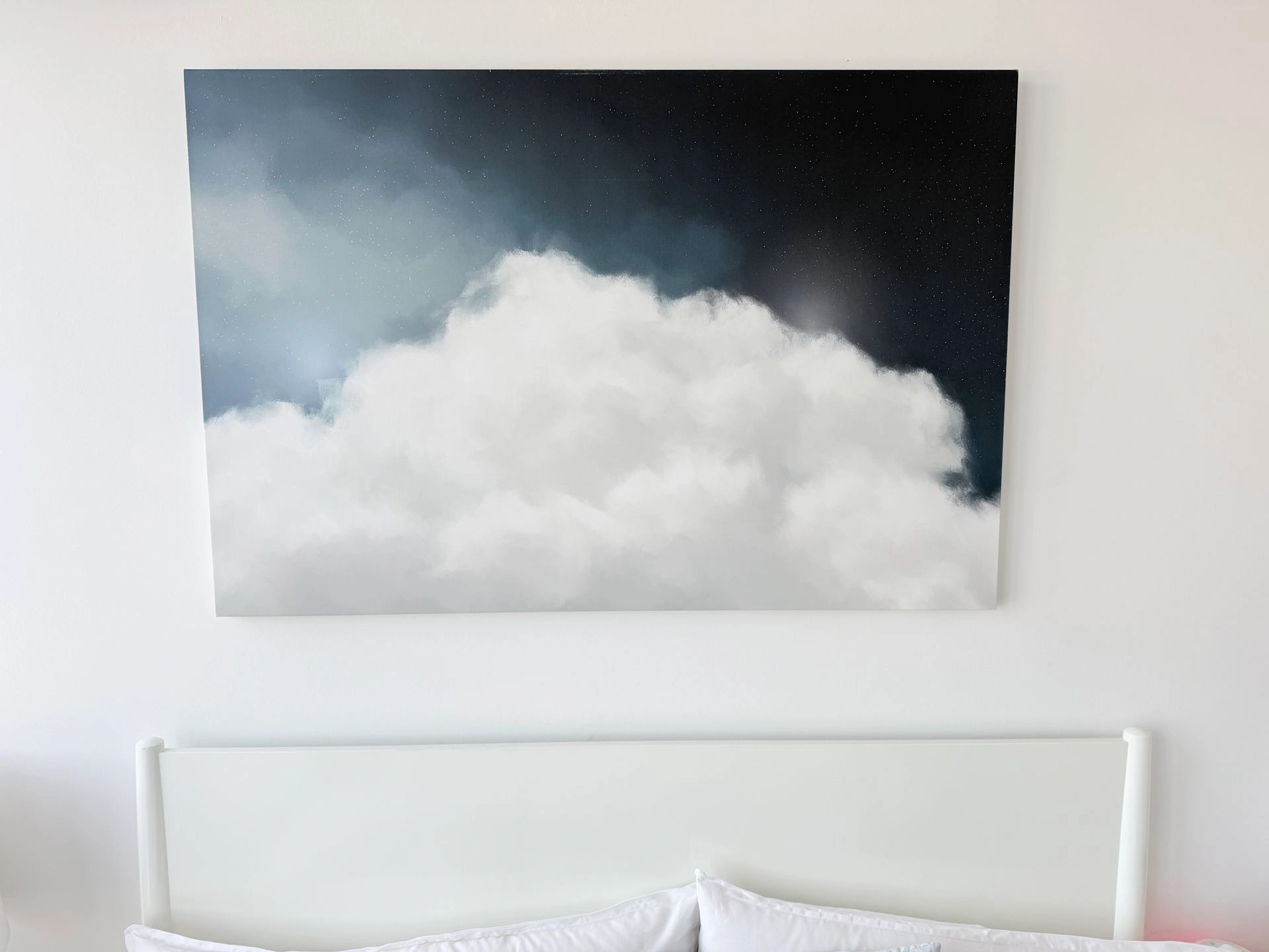Large canvas print features a dreamy depiction of clouds against a starry night sky. It’s a beautiful piece that can add a serene touch to any room. The artwork is printed on canvas, ready to hang. Purchased directly from an artist via Etsy a few years ago. Dimensions: 32 in x 48 in. Pickup only; cash, Zelle or Venmo.
