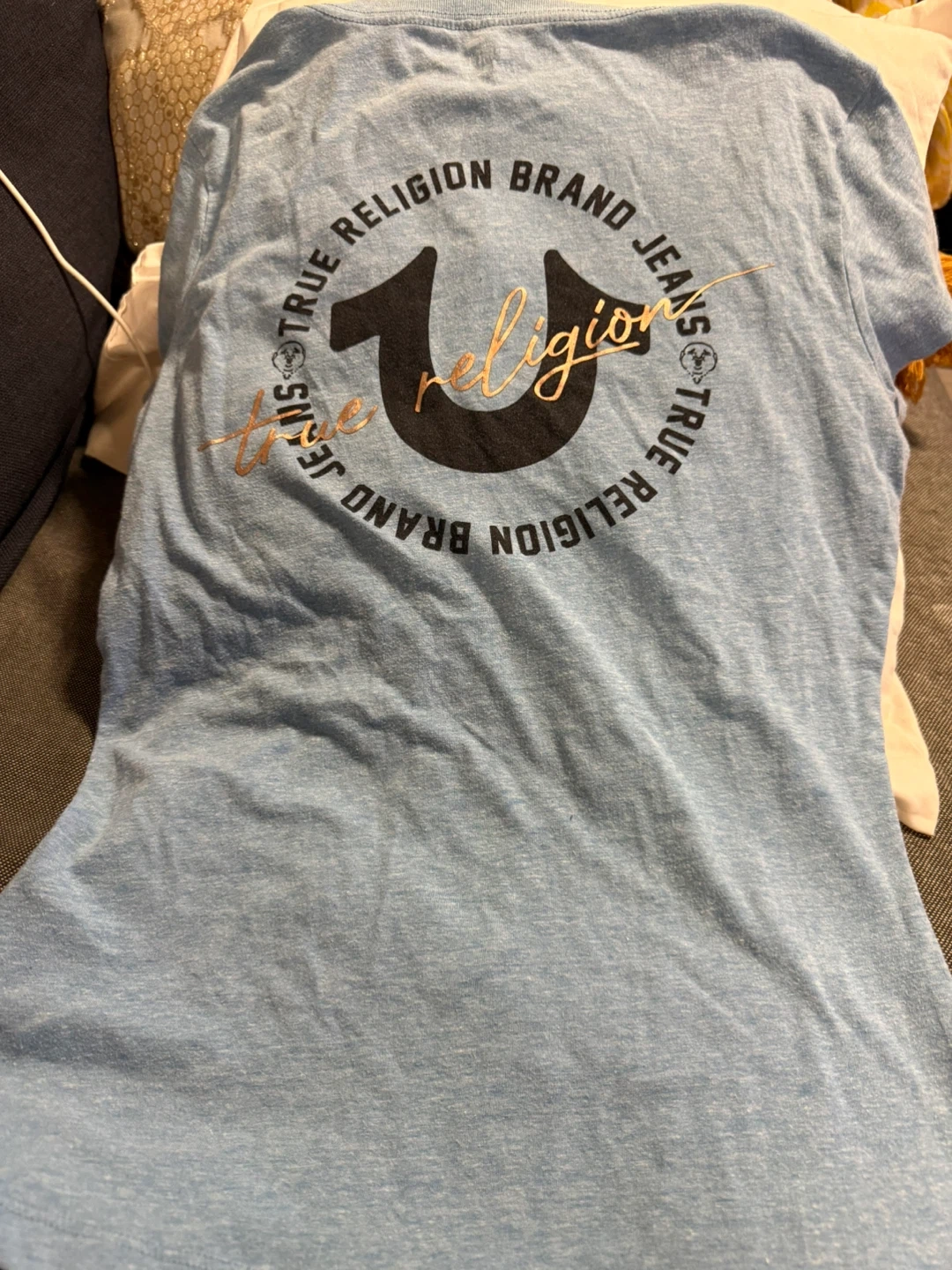 Light blue V-neck t-shirt with True Religion horseshoe logo on the front left chest and large circular logo on the back. Size XS. Made in China.