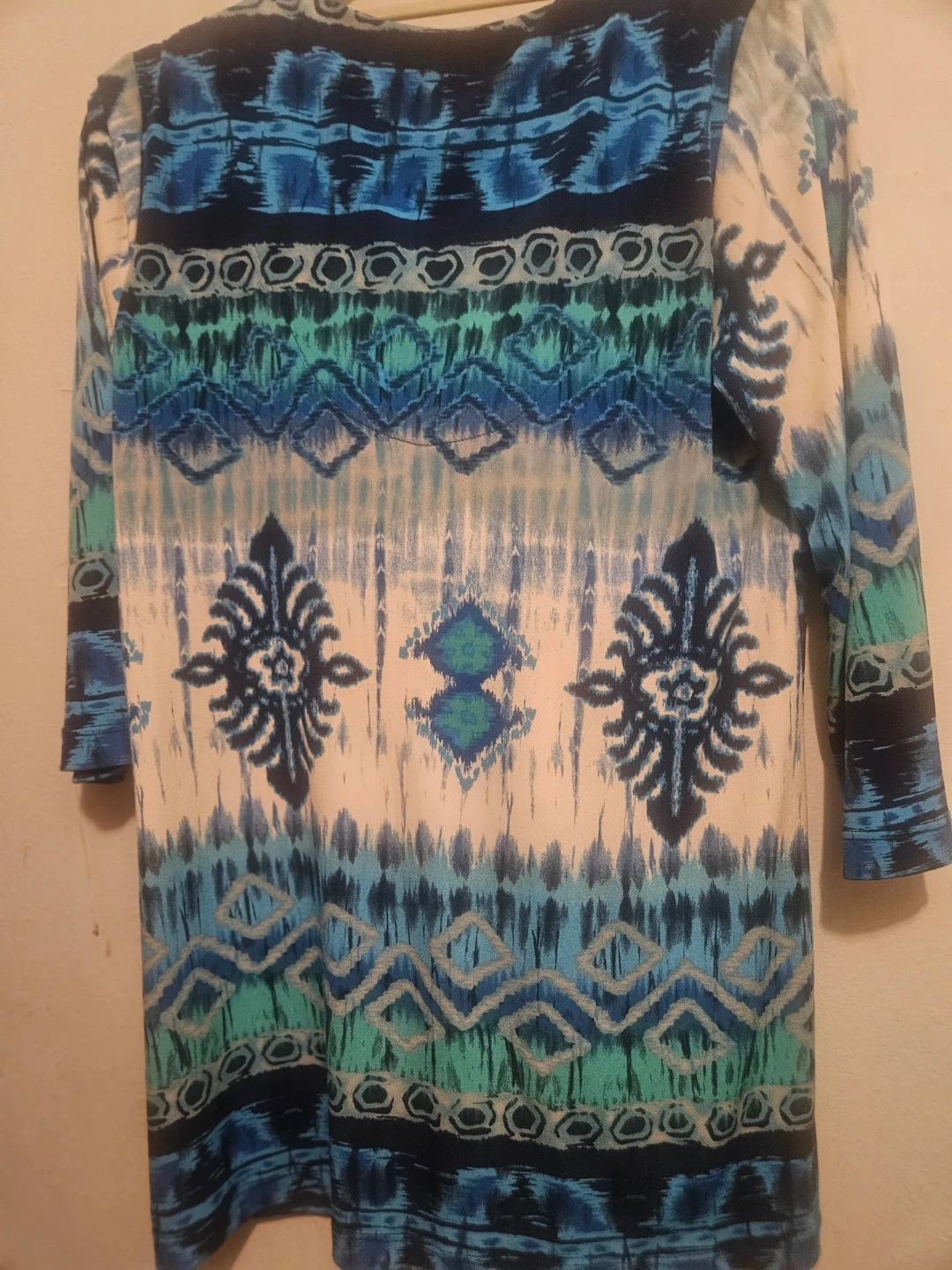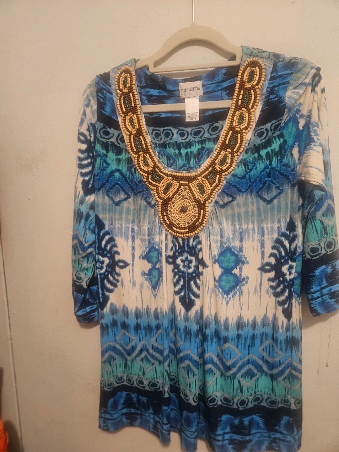 Chico's tunic top with wood beaded neckline. Features a colorful blue, green, and white tie-dye print. Three-quarter length sleeves. It's made of a comfortable, stretchy fabric. This top's unique beading makes it stand out!