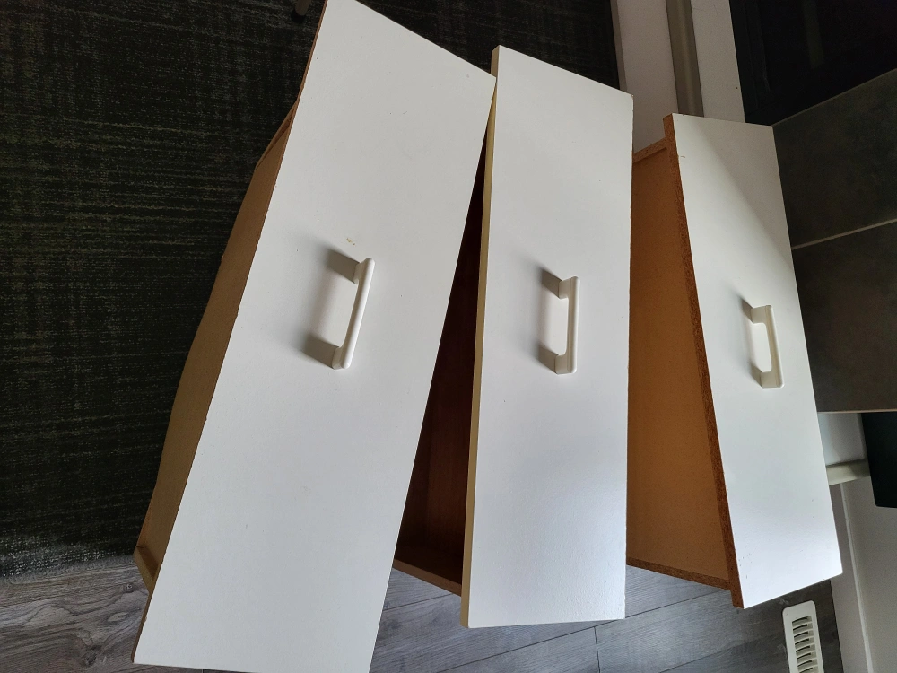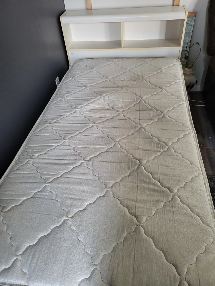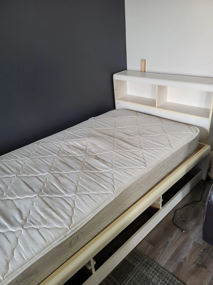 White single bed frame with headboard, storage drawers and a mattress. It features built-in shelves behind the headboard.