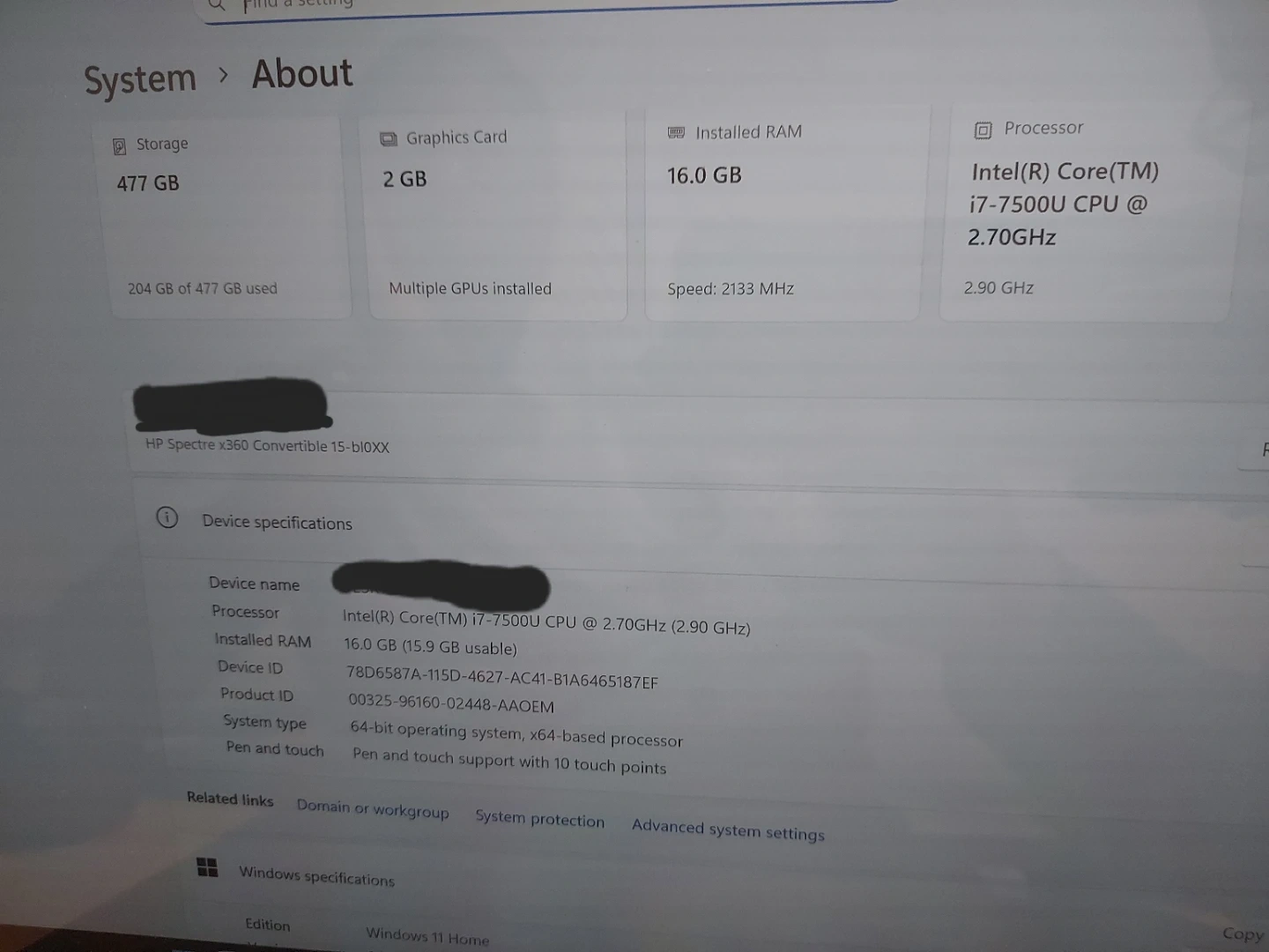 This HP Spectre x360 convertible laptop has an Intel Core i7-7500U processor and 16GB of RAM. It features a 477GB storage drive and 2GB of graphics card memory.