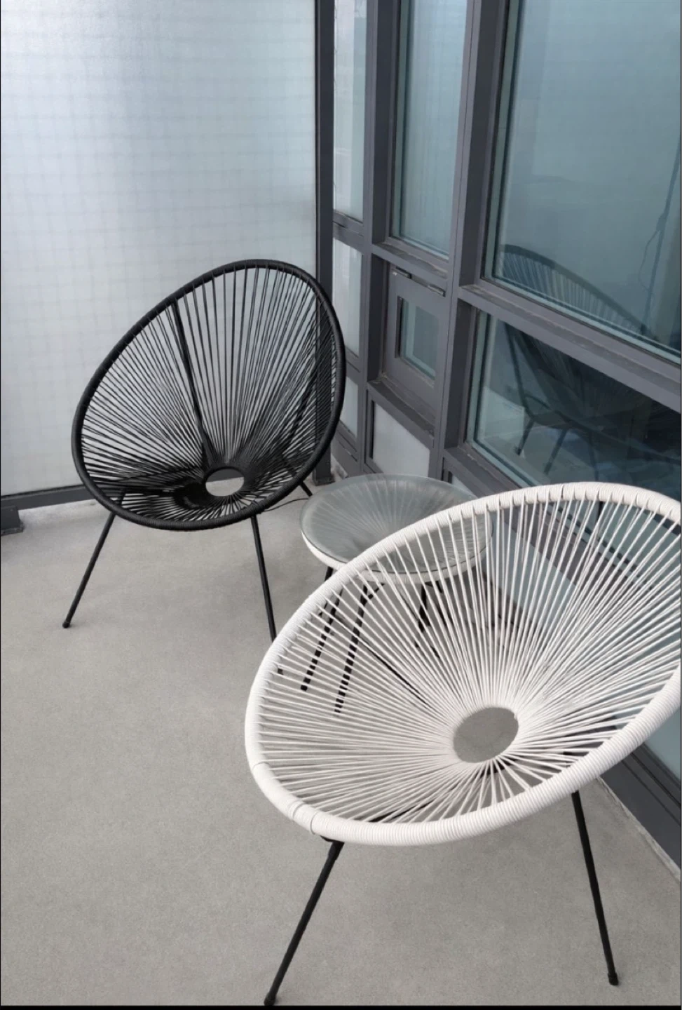 Stylish Acapulco chairs available in black and white. Features a durable woven cord seat and black metal legs. These chairs offer a unique, modern look for any outdoor or indoor space. They're great for relaxing on a patio or balcony!
