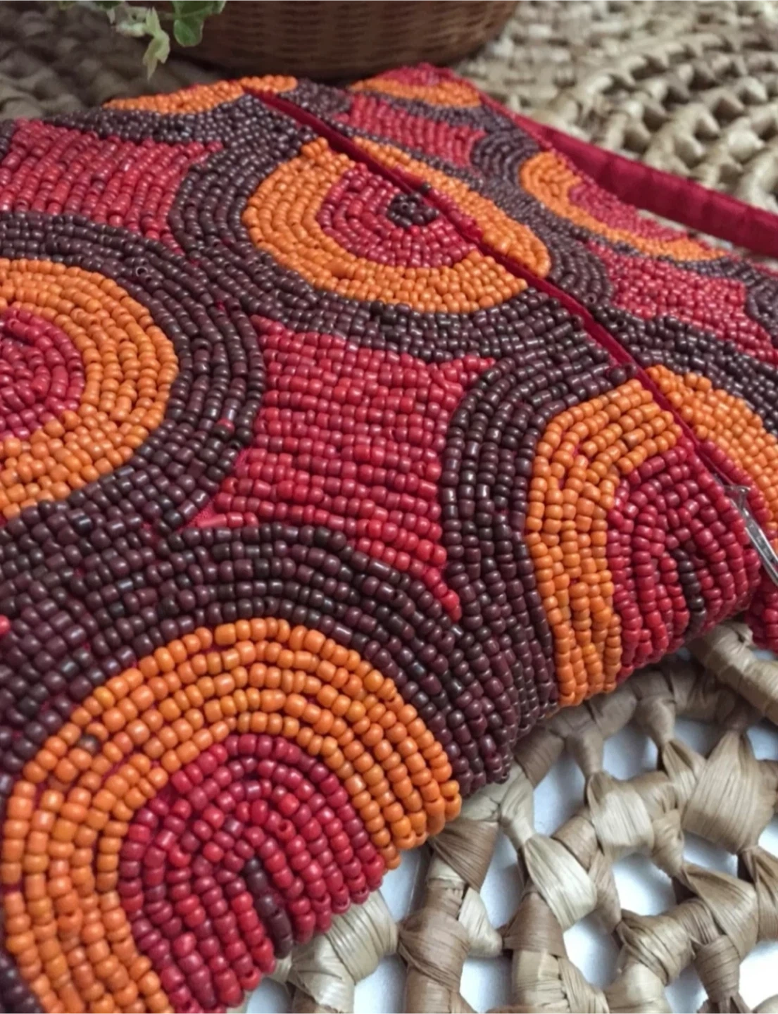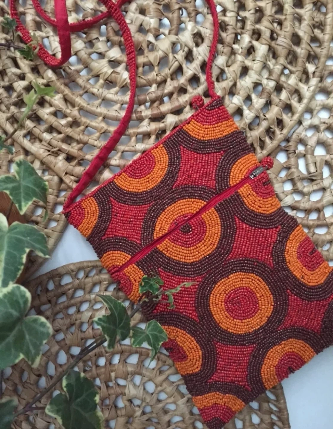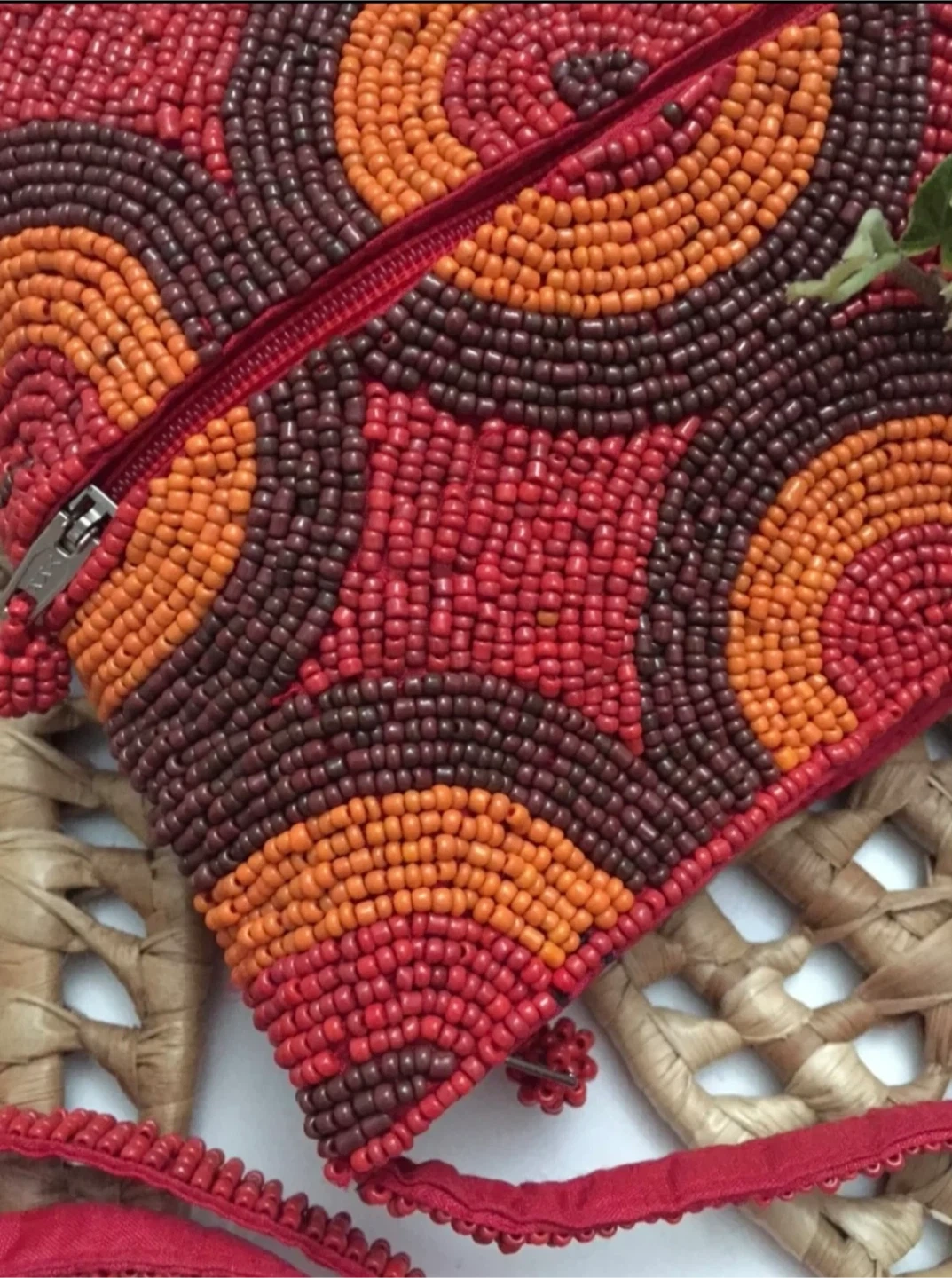 •This beautiful handmade beaded bag features a vibrant circle pattern in red, orange, and brown. It has a secure zipper closure and a matching red beadwork construction strap.