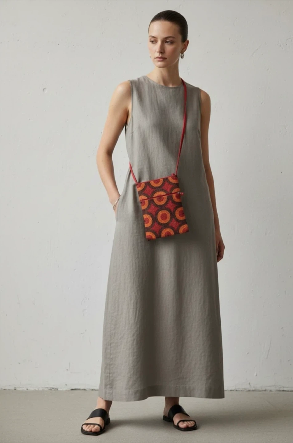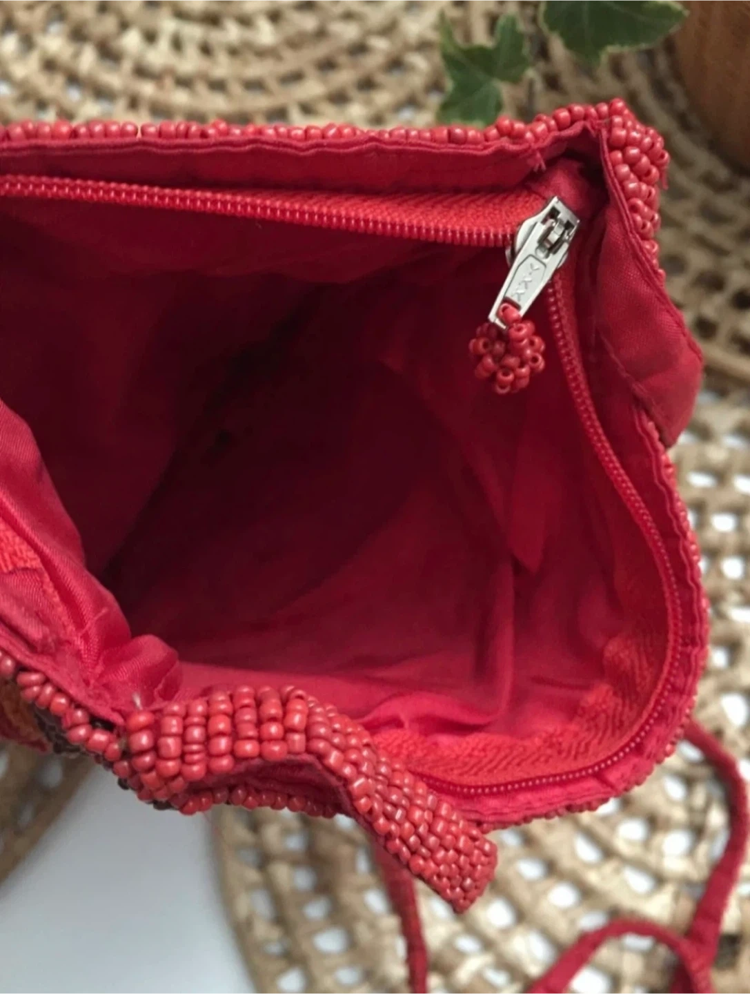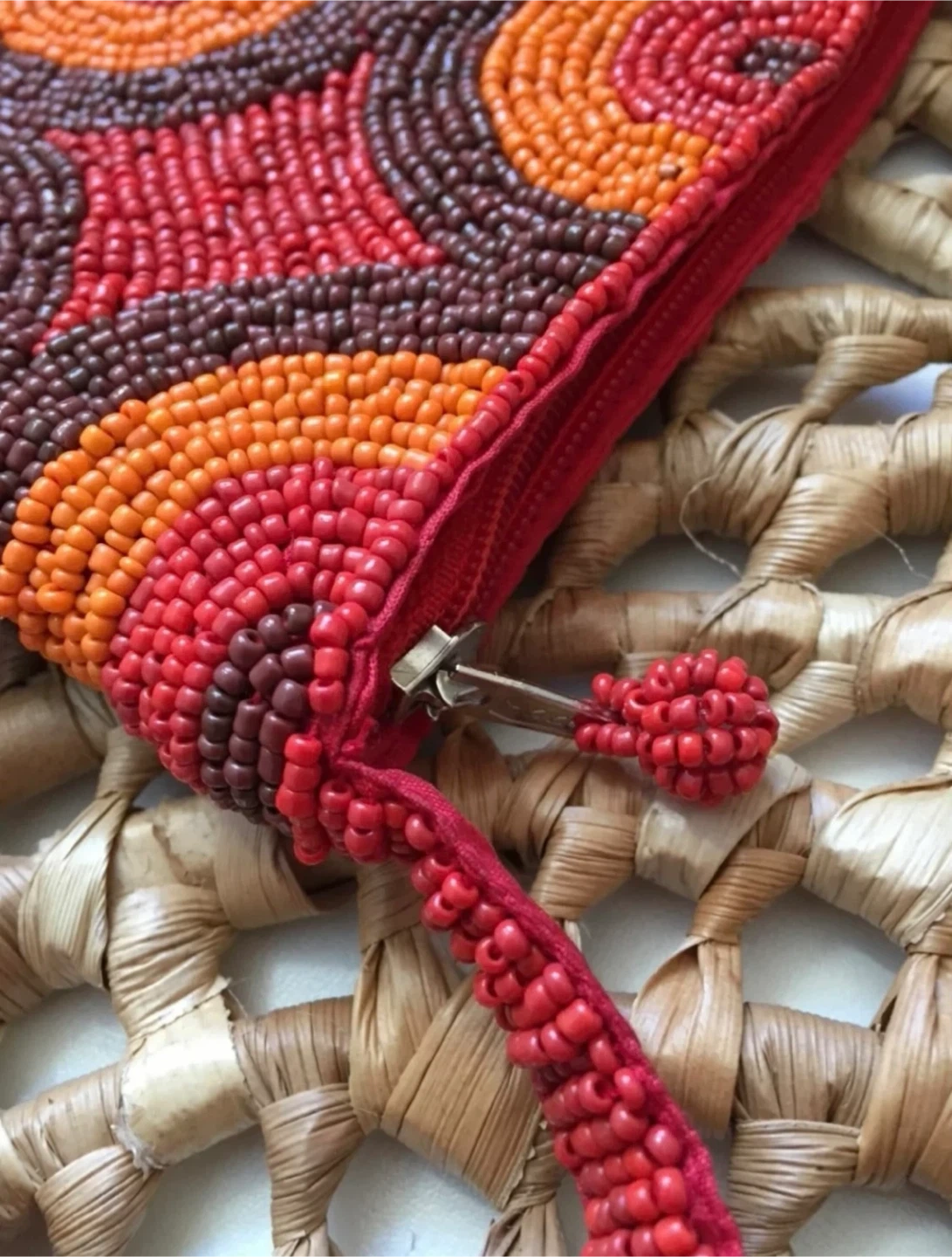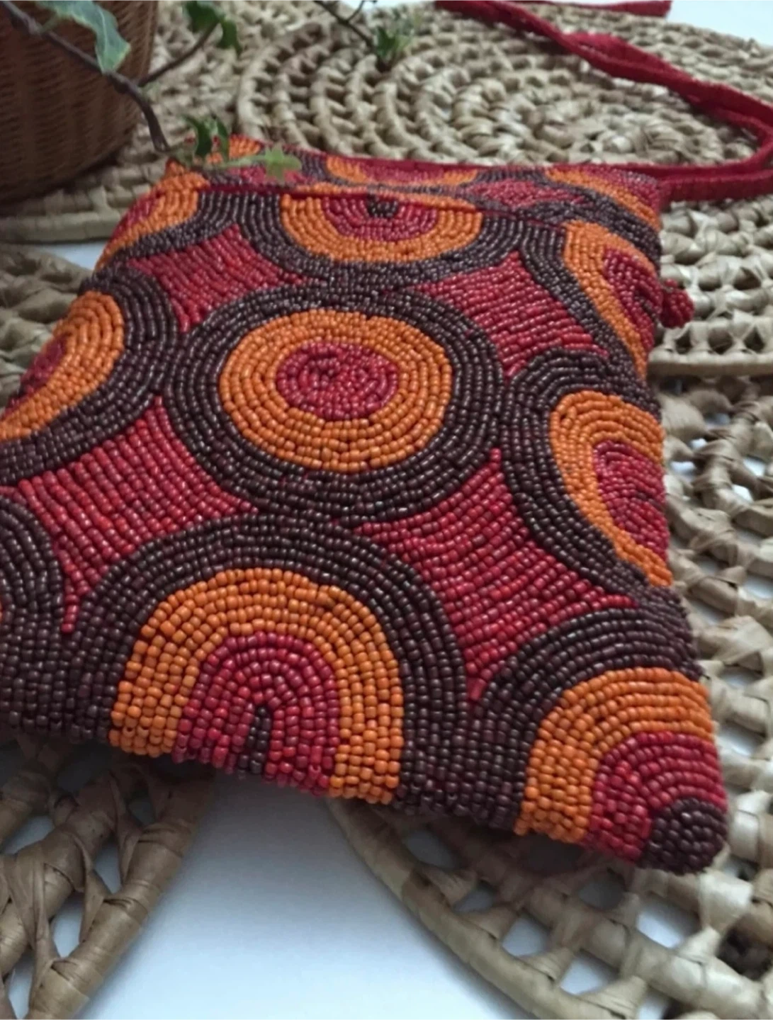 •This beautiful handmade beaded bag features a vibrant circle pattern in red, orange, and brown. It has a secure zipper closure and a matching red beadwork construction strap.