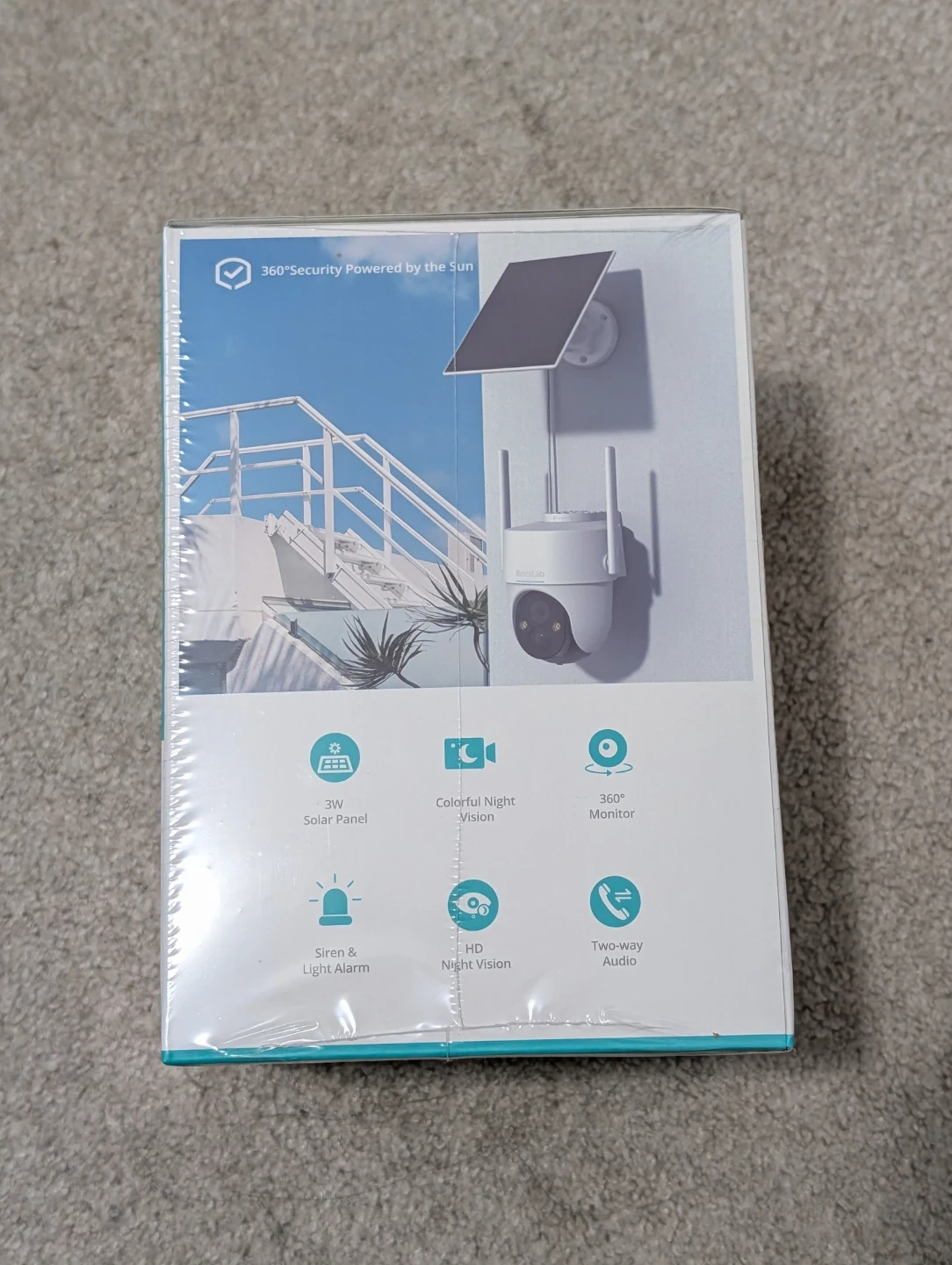 This is a 3MP, 2K resolution PT Battery Wi-Fi Camera by 360 Botslab. It includes a 3W solar panel and a 5200mAh battery. It also offers colourful night vision, AI human detection, and two-way audio. Works with Alexa & Google Assistant.