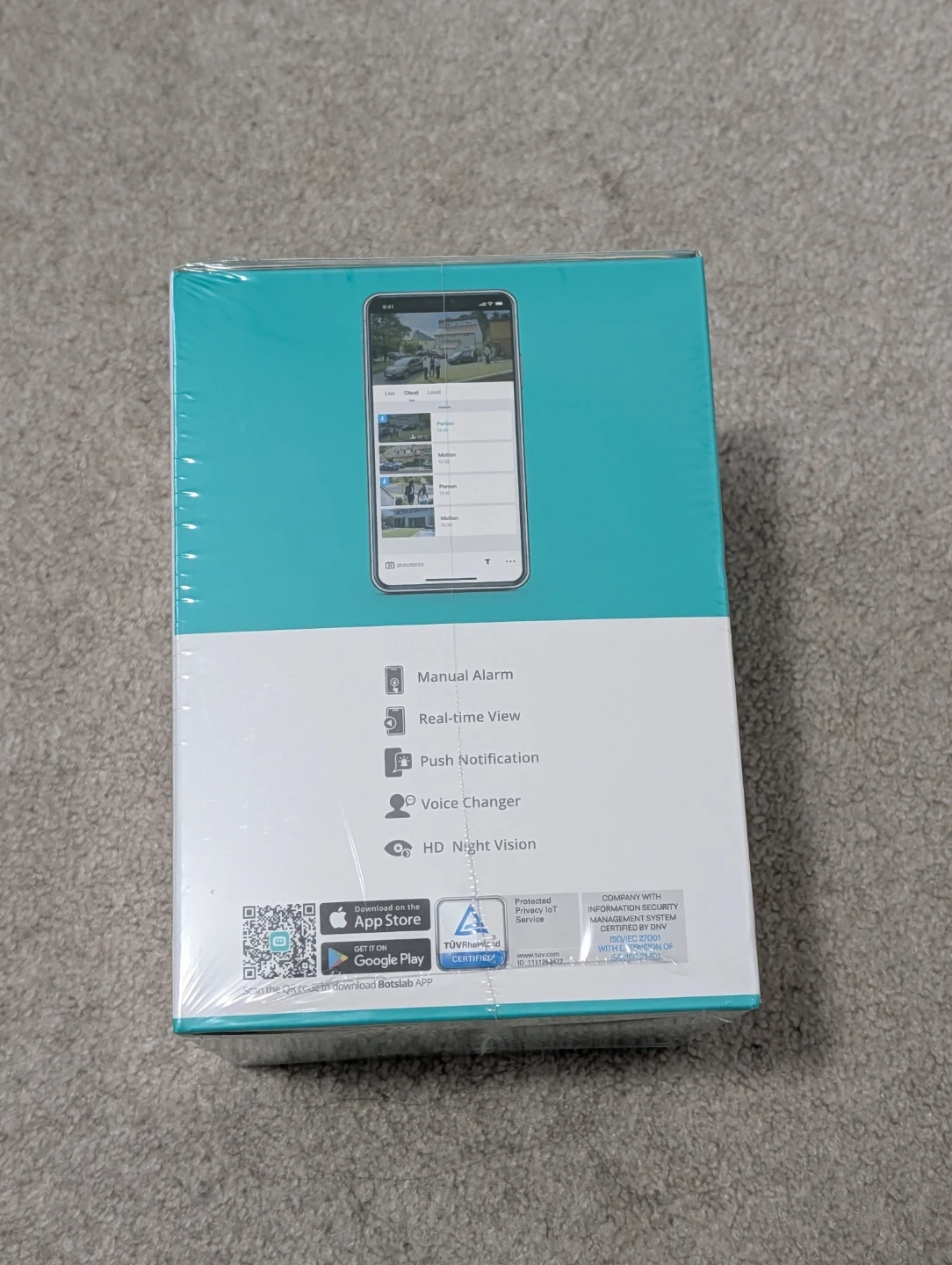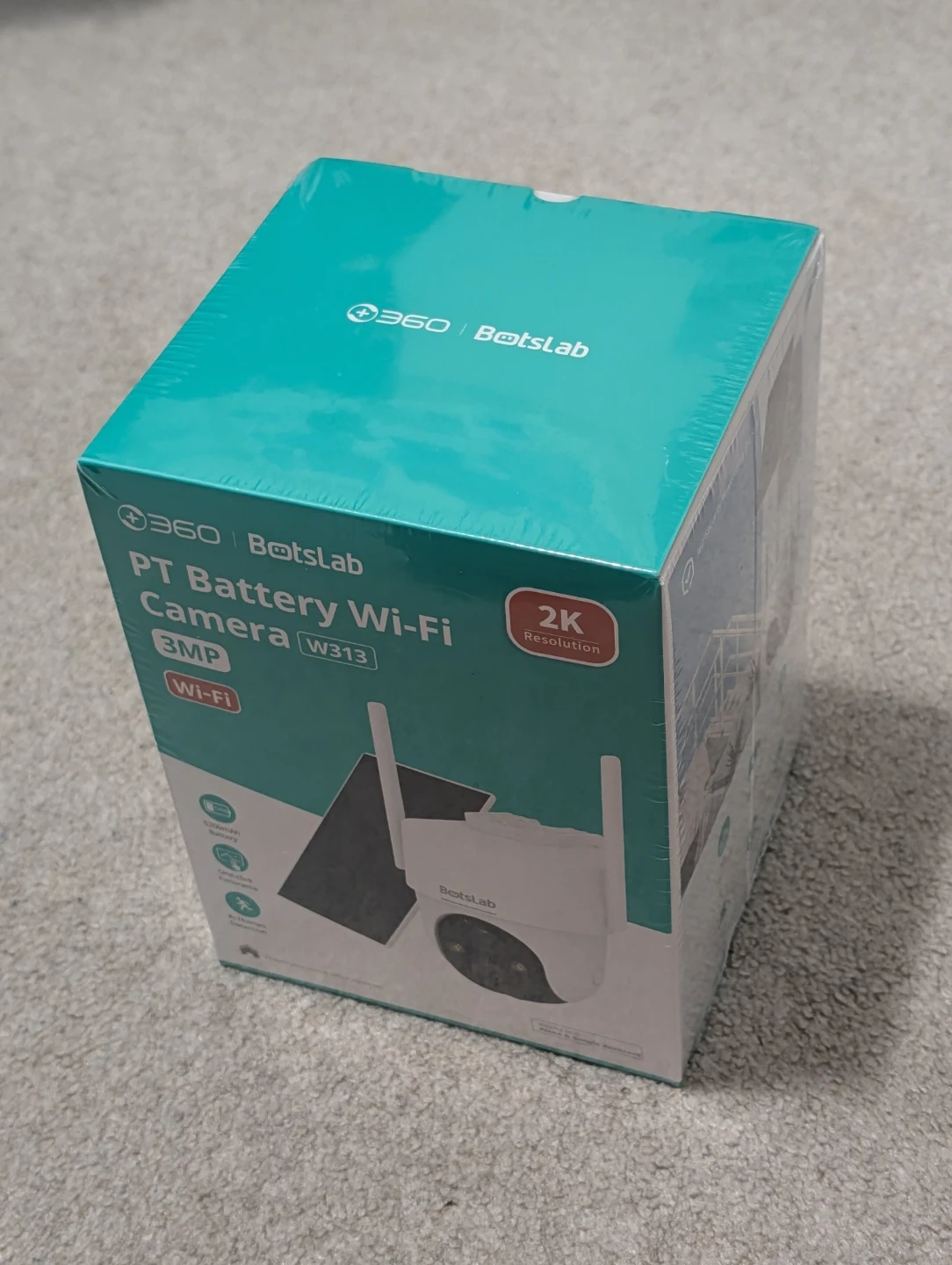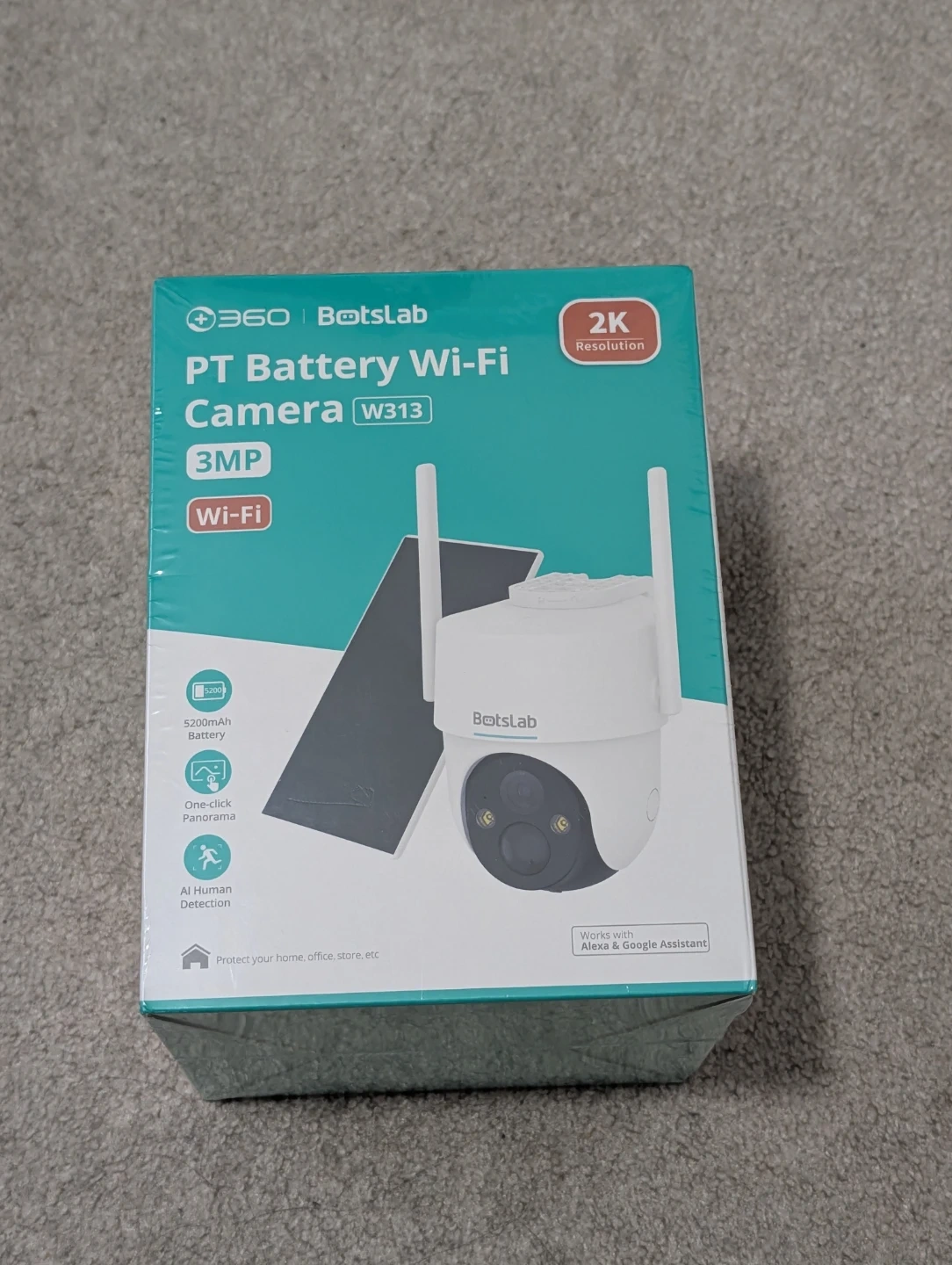 This is a 3MP, 2K resolution PT Battery Wi-Fi Camera by 360 Botslab. It includes a 3W solar panel and a 5200mAh battery. It also offers colourful night vision, AI human detection, and two-way audio. Works with Alexa & Google Assistant.