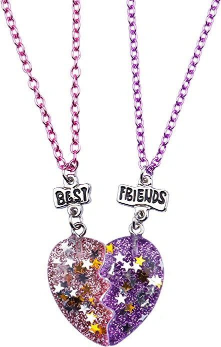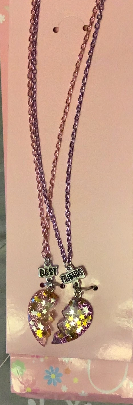 Make your best friend feel special with our cute and charming BFF necklace. Share your stories and the hearts of the necklace to remind each other of your special bond. Our set includes 2 purple and pink heart-shaped pendants with glitter and stars in it on a chain with clasp closure in pink and purple tone finish respectively. The beautiful necklaces come with ‘Best’ and ‘Friend’ tags to secure your bond. The chain length is 16” with a 3” extender. A true reminder of an eternal friendship. I have a few boxes of these available at my price of $10 each set.