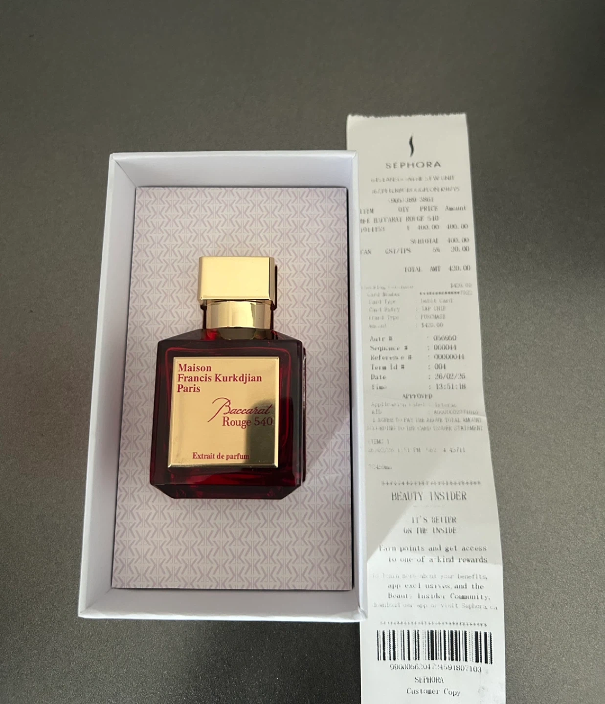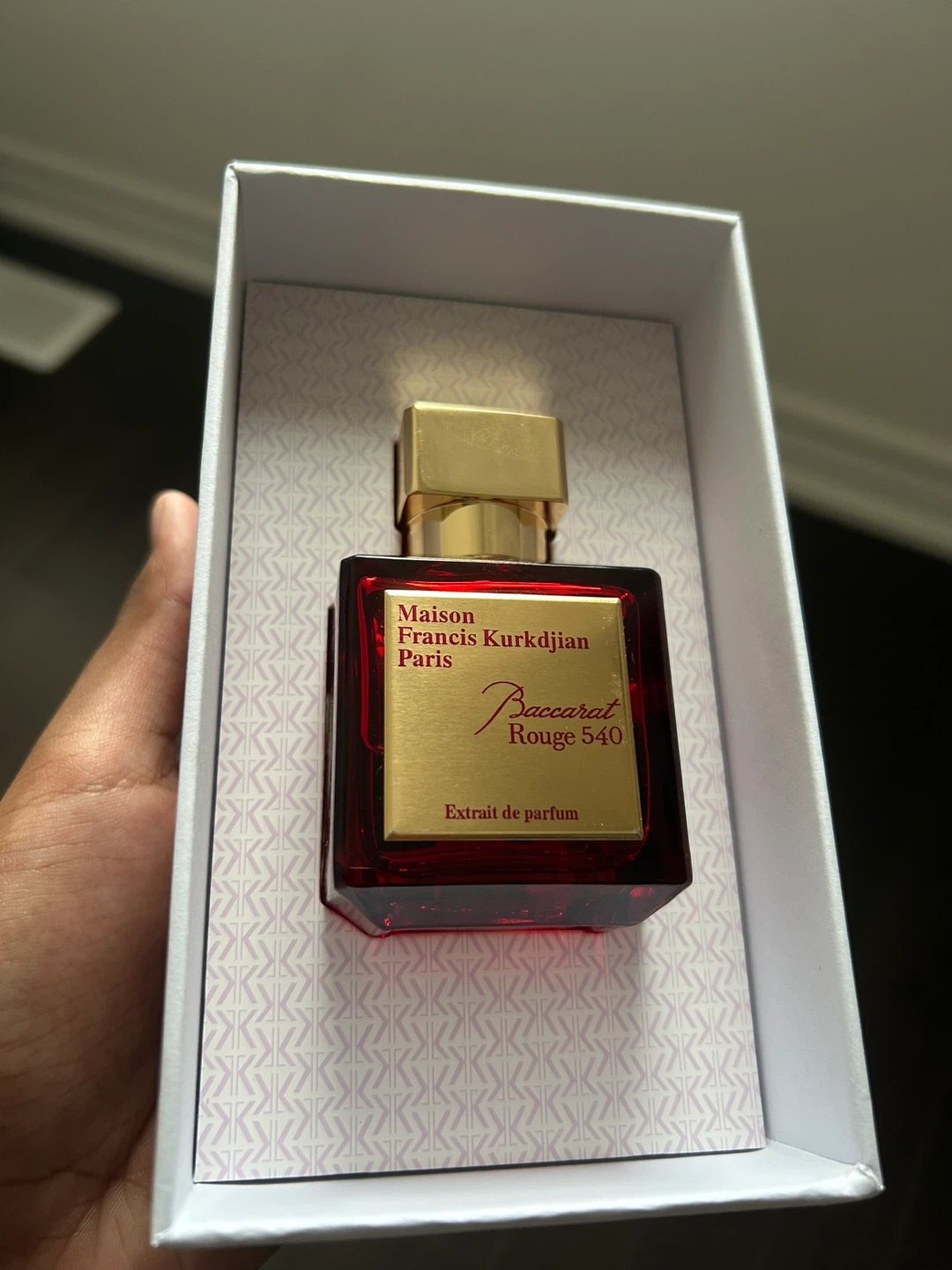 This is the Maison Francis Kurkdjian Baccarat Rouge 540 Extrait de Parfum. It comes in a distinctive red bottle with a gold cap. The fragrance is housed in its original box.