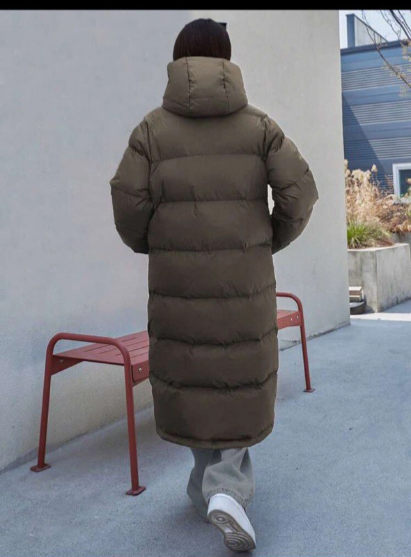 Warm and stylish long puffer jacket. Features a large hood and long length. Great for cold weather. Olive green colour. Excellent condition.