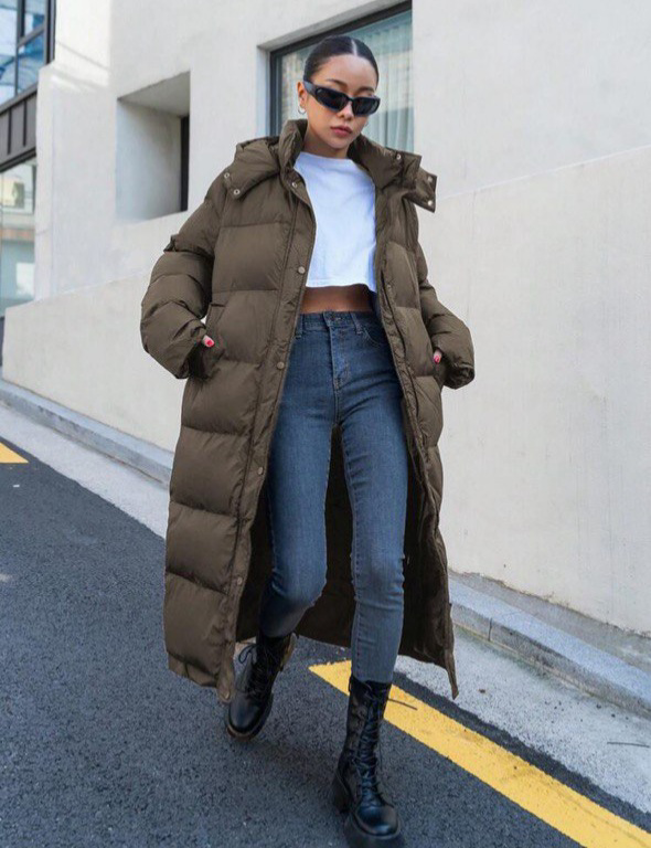 Warm and stylish long puffer jacket. Features a large hood and long length. Great for cold weather. Olive green colour. Excellent condition.