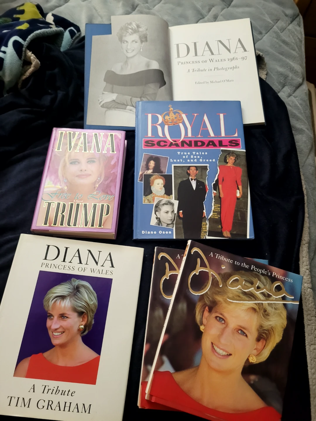 I'm giving away a collection of books about Diana, Princess of Wales, and Ivana Trump. Titles include 'Diana Princess of Wales 1961-97 A Tribute in Photographs', 'Ivana Free to Love Trump', 'Royal Scandals', and 'Diana Princess of Wales A Tribute'. Great for collectors!