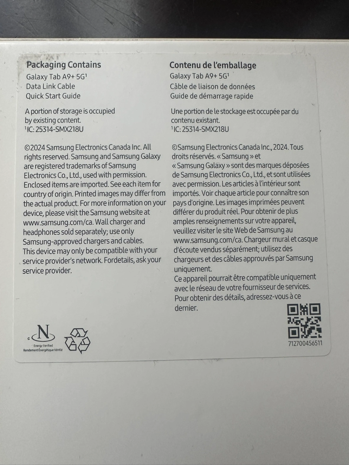 Samsung Galaxy Tab A9+ 5G in Graphite. It includes a Data Link Cable and Quick Start Guide.