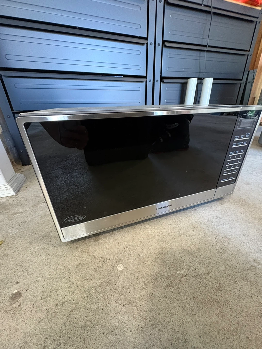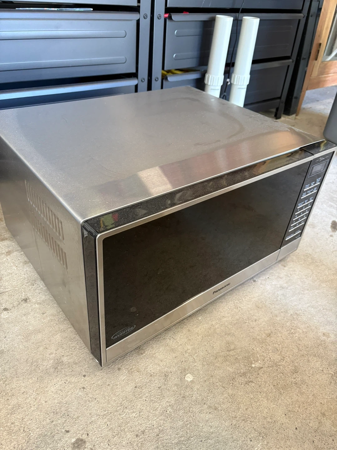 Panasonic microwave oven with inverter turbo defrost and sensor cook functions. It has 10 power levels and a quick 30-second cook option. Measures 23.6 inches wide.