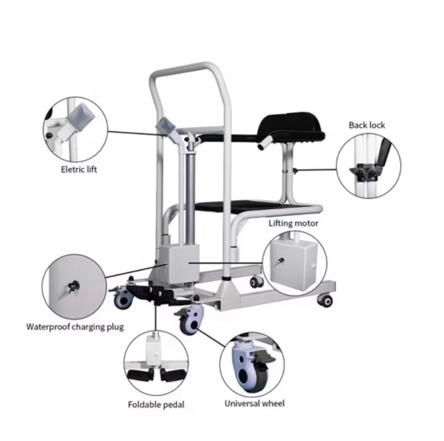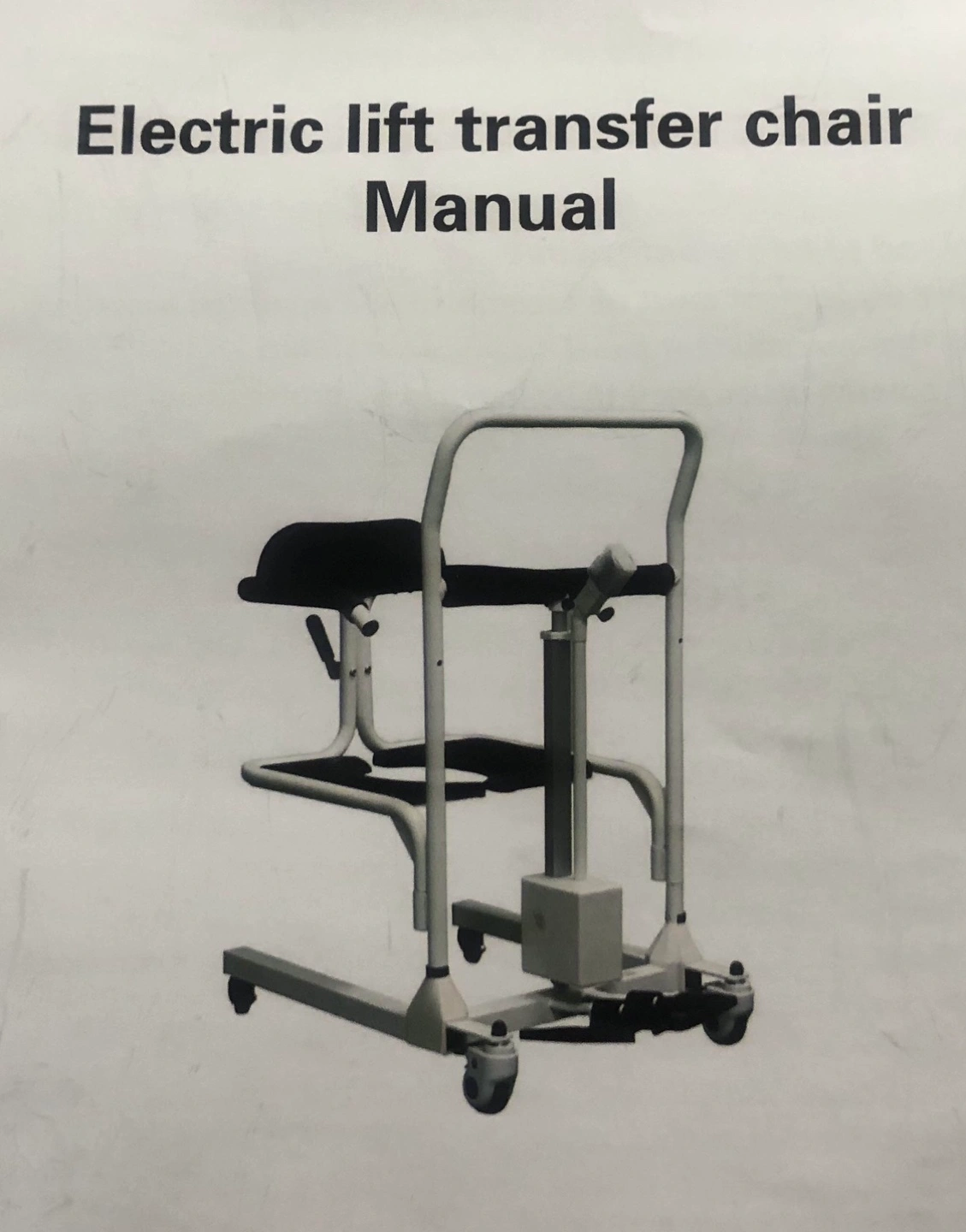 Electric lift transfer chair with adjustable height. Features 180 degree swivel seat, foldable footrest, universal wheels, and a waterproof charging plug. Comes with manual.