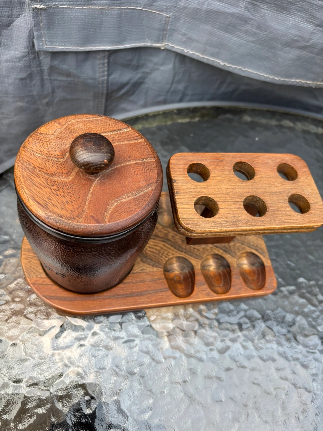 Selling a vintage humidor jar with a wooden pipe stand. The jar appears to be in good condition and the stand is a nice accent piece for any collector or enthusiast. It's a unique set!