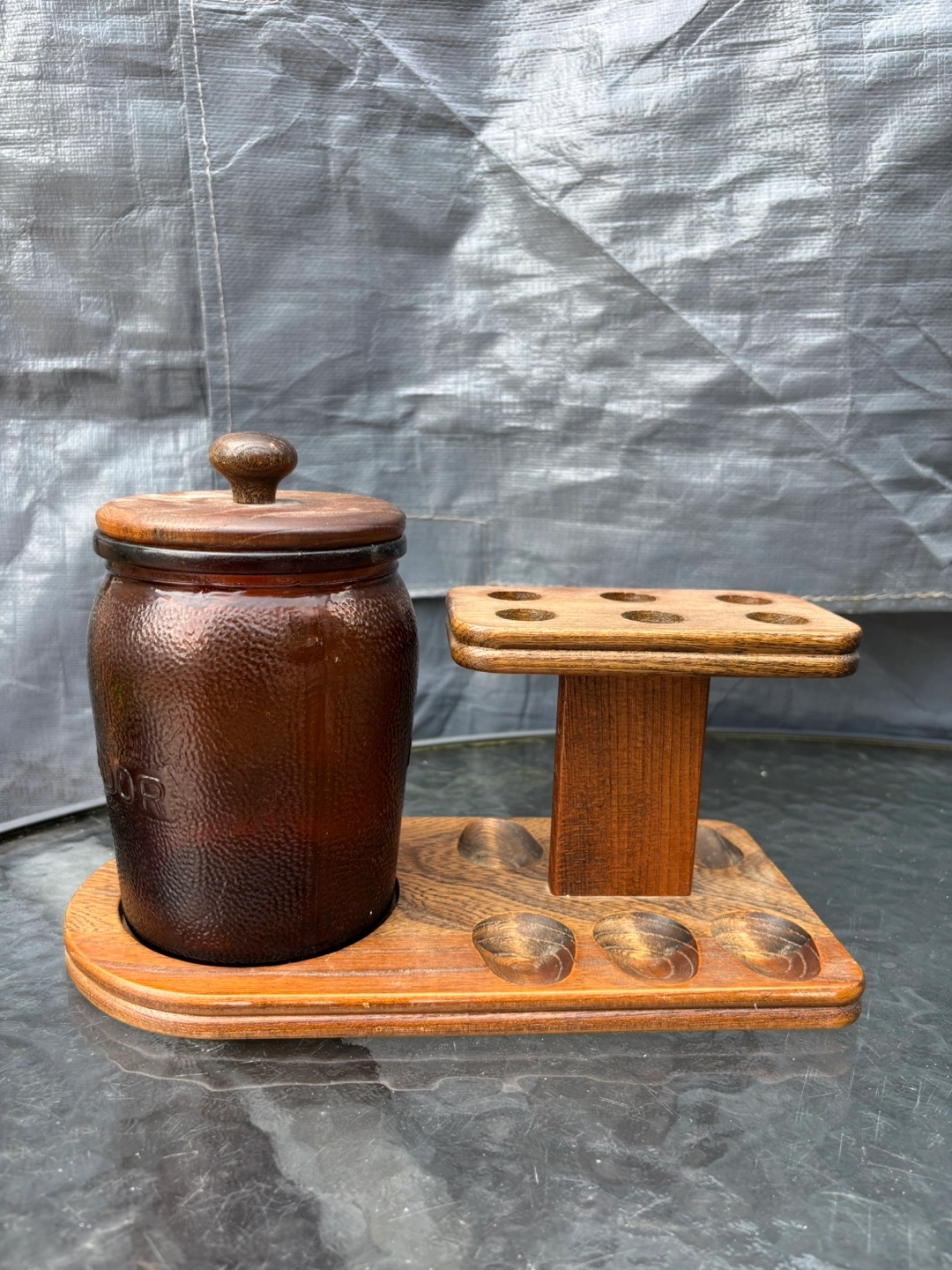 Selling a vintage humidor jar with a wooden pipe stand. The jar appears to be in good condition and the stand is a nice accent piece for any collector or enthusiast. It's a unique set!