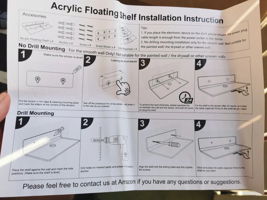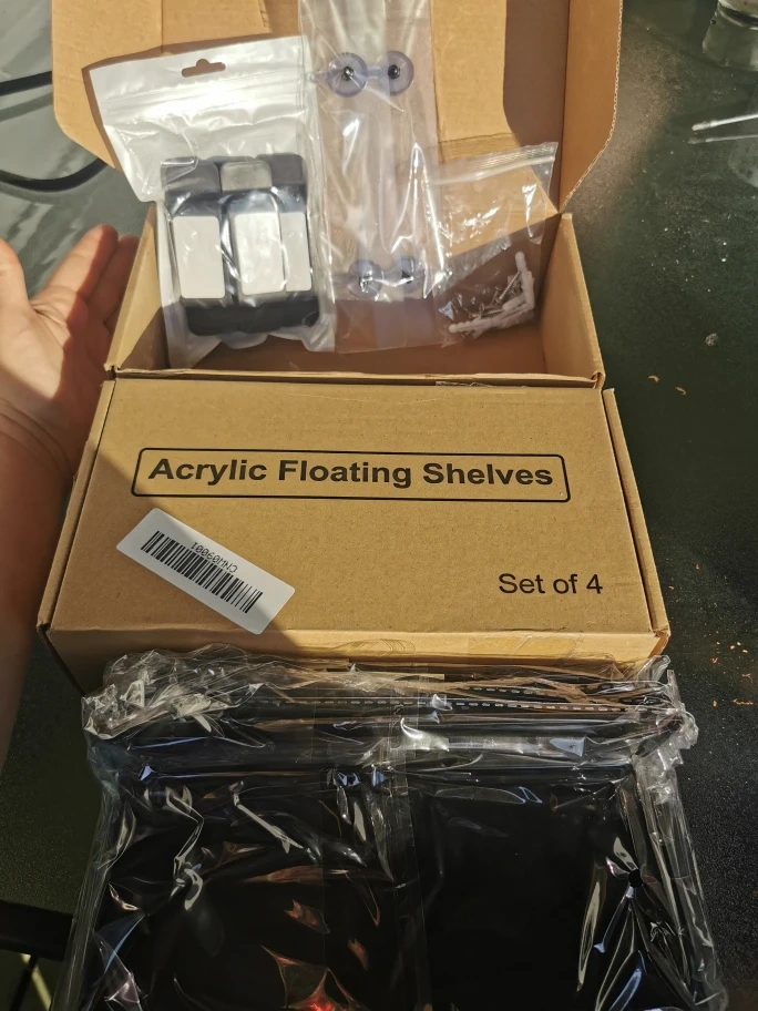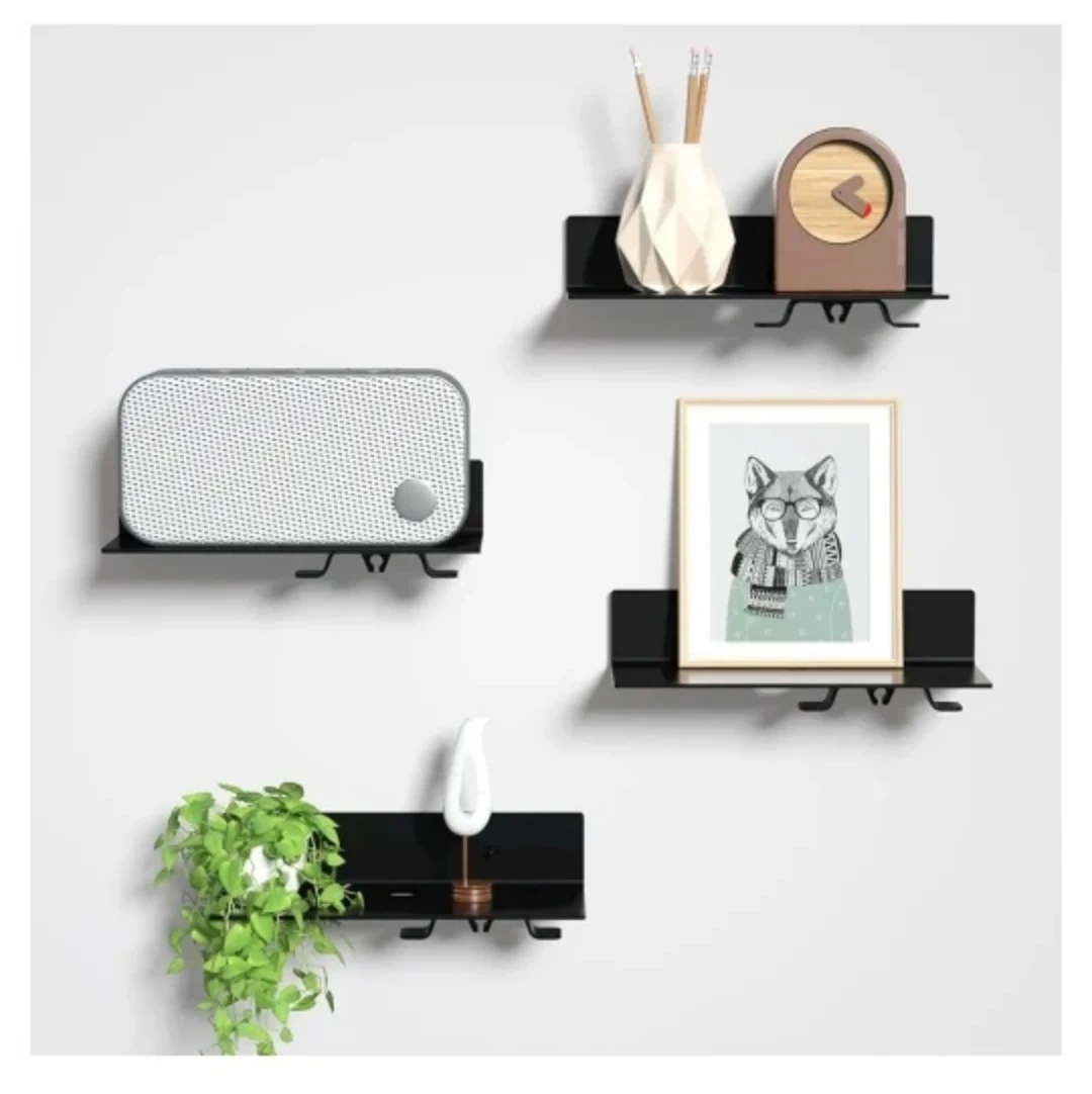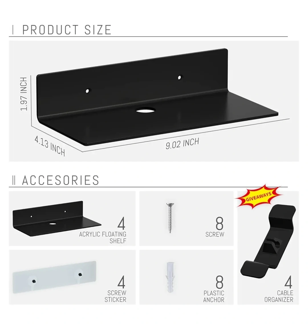 Set of 4 black floating shelves with a maximum load of 4.5 lbs with the screw sticker mount and 6.5 lbs with a screw mount. Comes with all hardware including anchors, screws, and cable organizers and instruction manual.