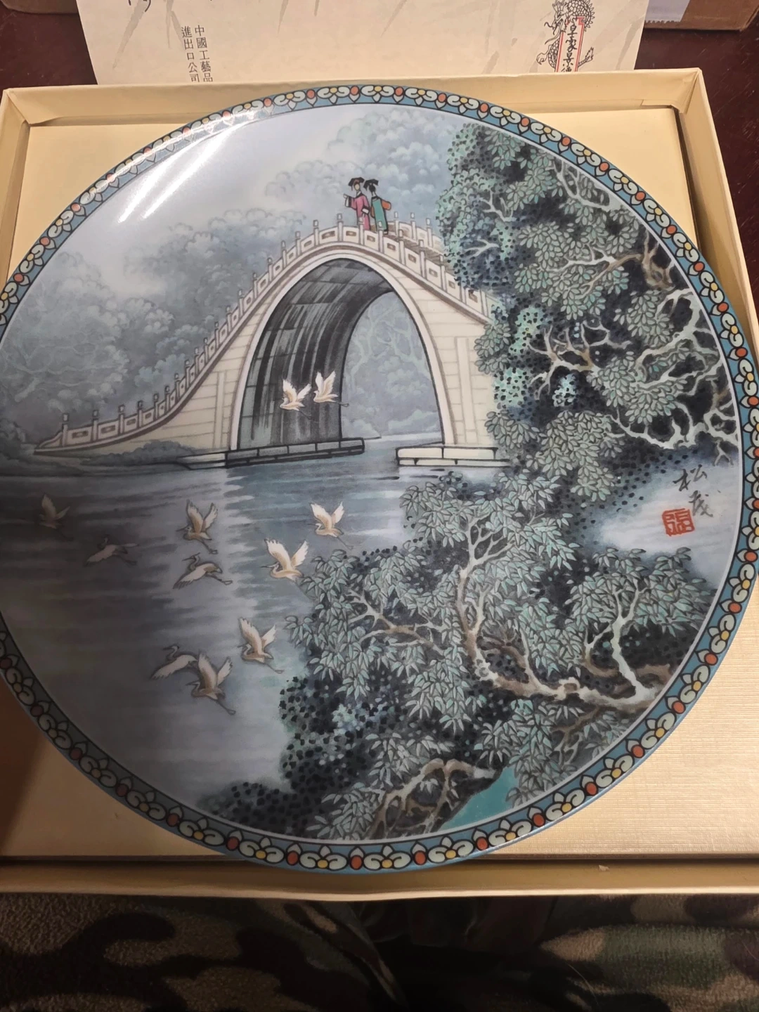 This decorative plate features a scenic design of a bridge with figures and flying cranes. It includes a certificate of authenticity. It's a beautiful piece for display.