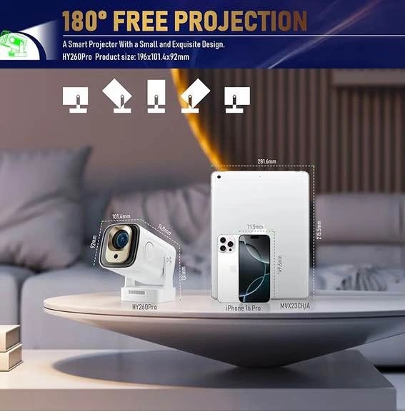 Mini Projector with WiFi and Bluetooth, 4K Full HD 200ANSI, 180° Rotatable Portable Projector, Movie Projector, Compatible with Smartphone, TV Stick, Laptop, HDMI, USB