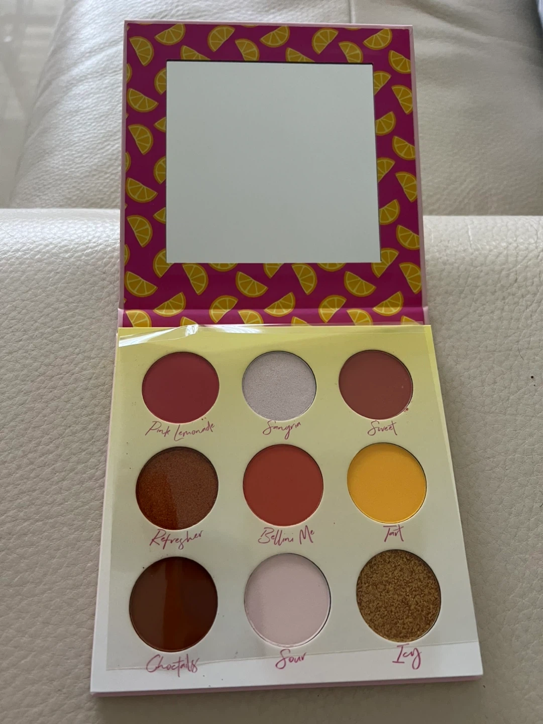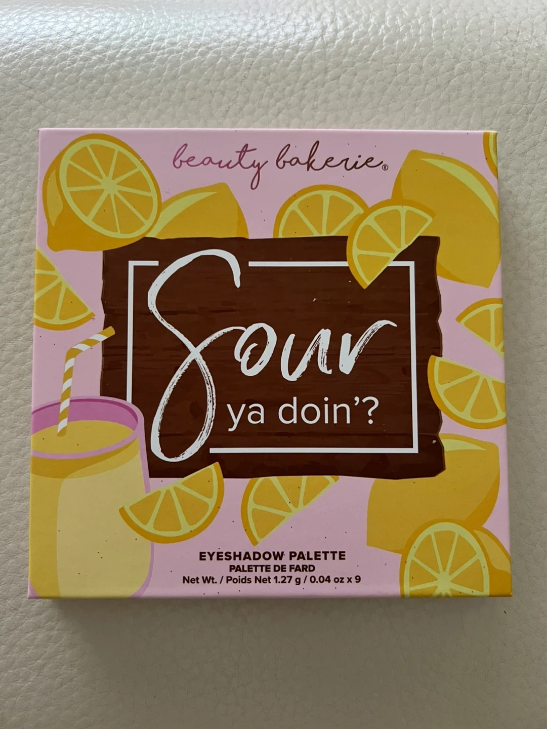 This Beauty Bakerie eyeshadow palette features nine shades inspired by 'Sour Ya Doin?' with names like Pink Lemonade, Sangria, and Sweet. It comes with a mirror. Net Wt. / Poids Net 1.27 g / 0.04 oz x 9. Last picture is another colour set!
