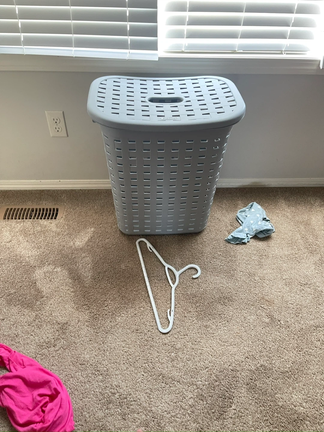 This grey laundry basket is made of durable plastic with a woven design. It features a lid and convenient carrying handles. It's a practical storage solution for clothes.