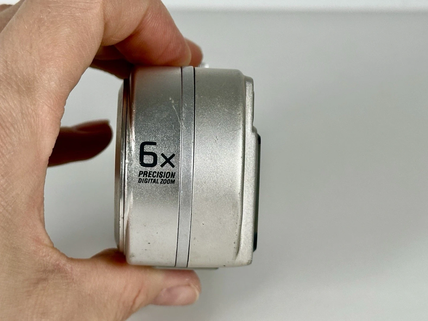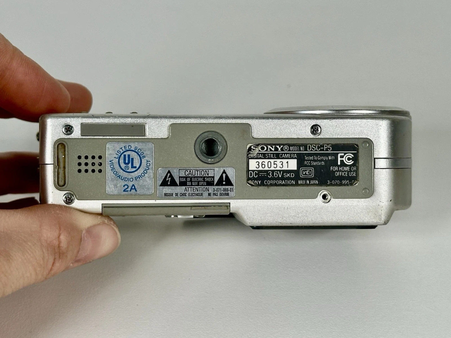 Sony Cyber-shot DSC-P5 digital camera. Features 3.2 MP, 6x digital zoom, 3x optical zoom, USB connectivity, and a Lithium-Ion battery. Color is silver. Untested.