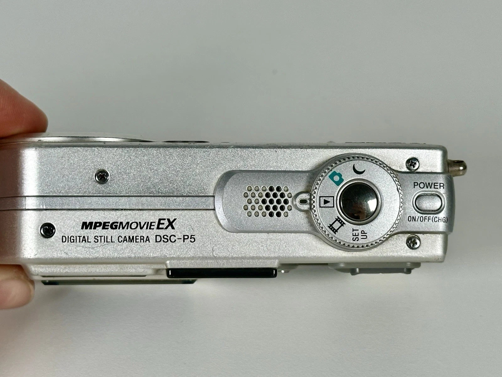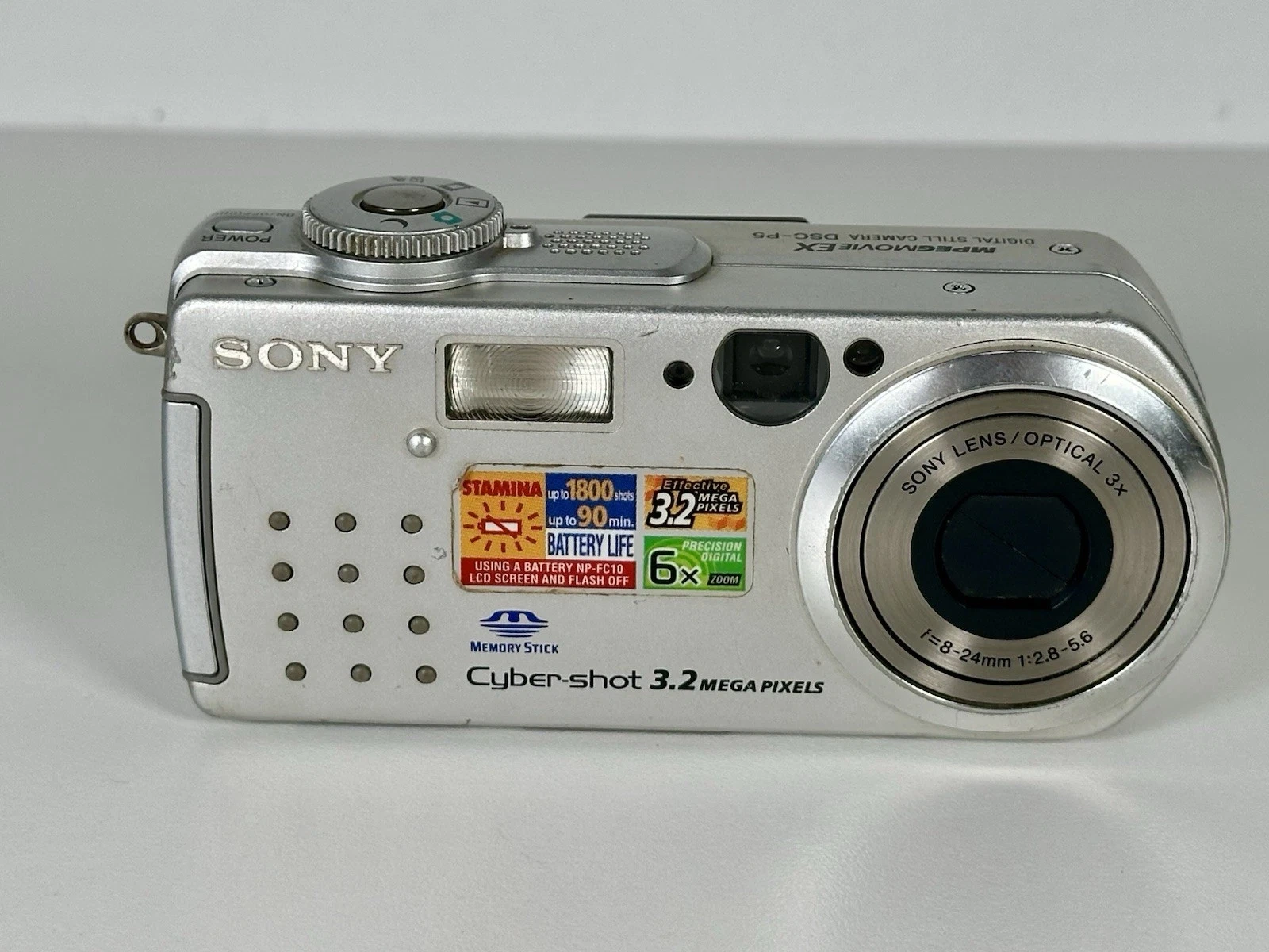 Sony Cyber-shot DSC-P5 digital camera. Features 3.2 MP, 6x digital zoom, 3x optical zoom, USB connectivity, and a Lithium-Ion battery. Color is silver. Untested.