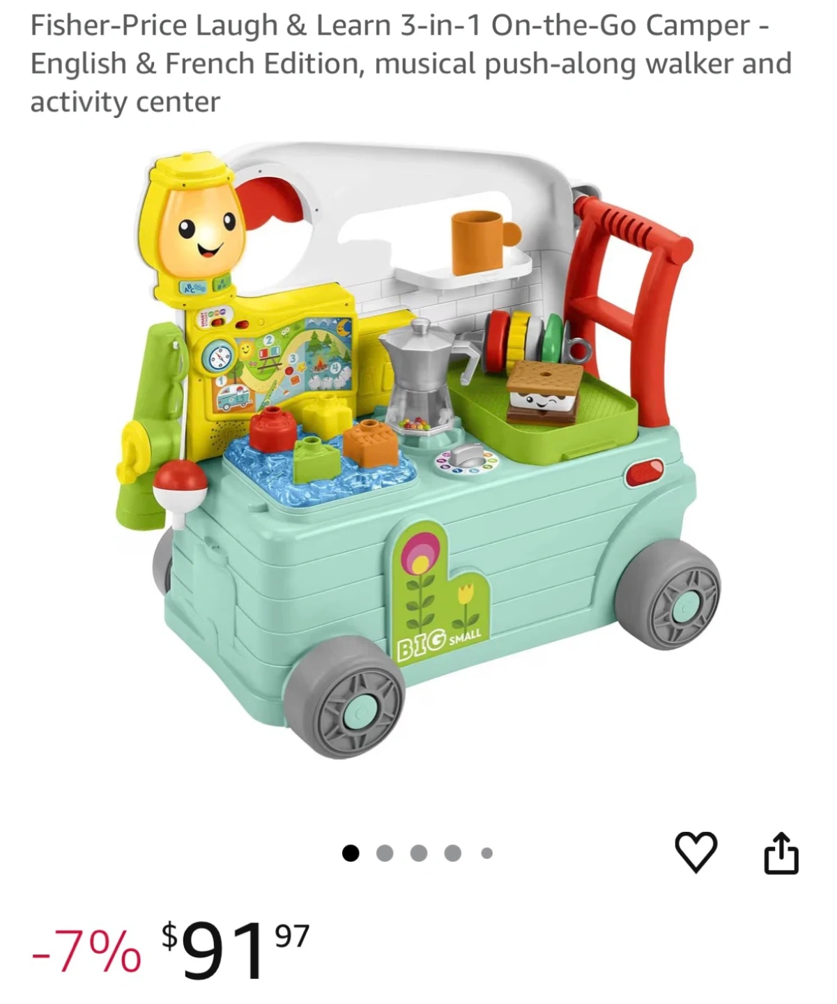 Got two of similar items as a gift , I have not opened it it’s new . This Fisher-Price Laugh & Learn 3-in-1 On-the-Go Camper is a musical push-along walker and activity center. It's designed for English and French editions, offering interactive play. It has colourful interactive stations and activities for little ones to explore.