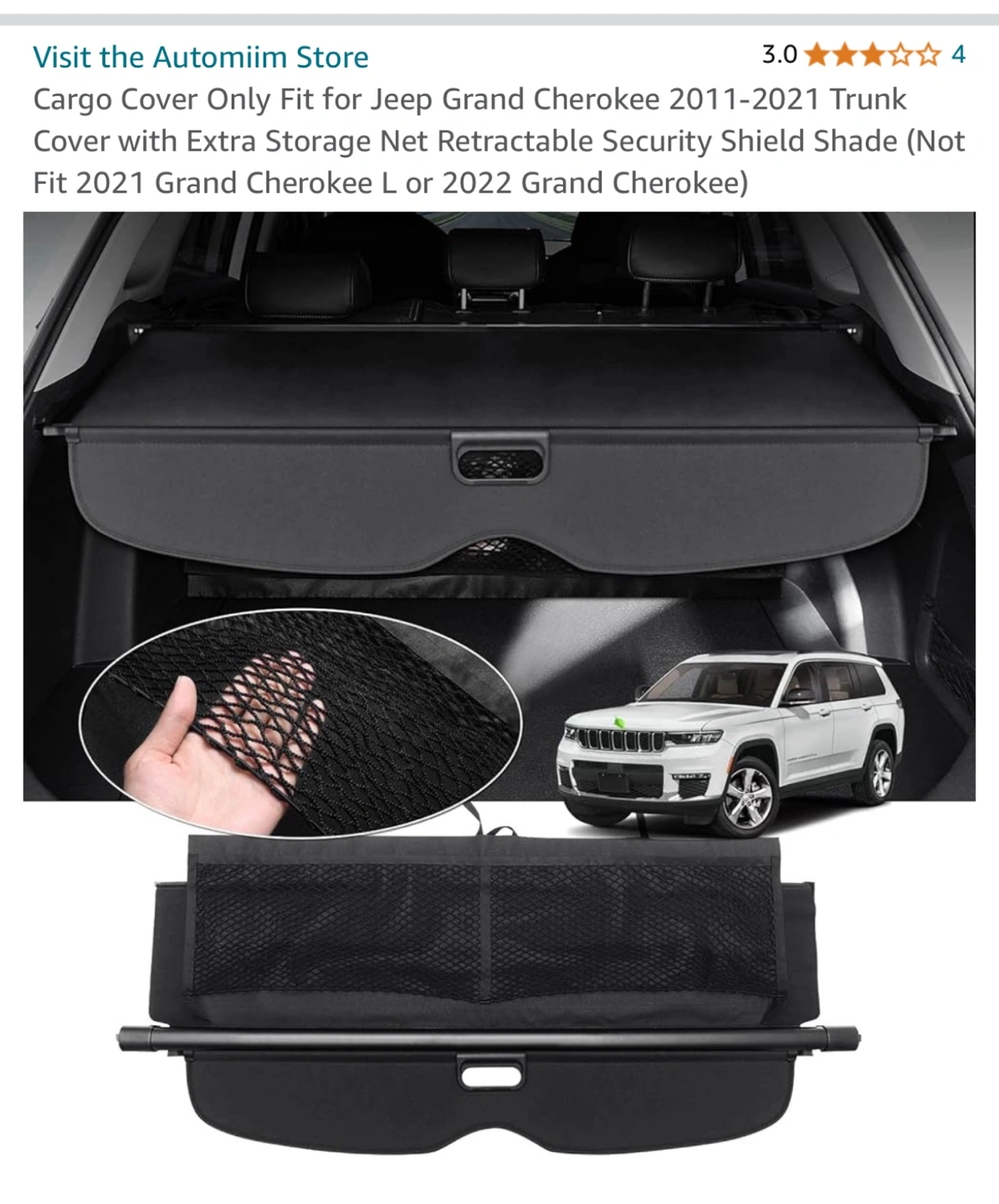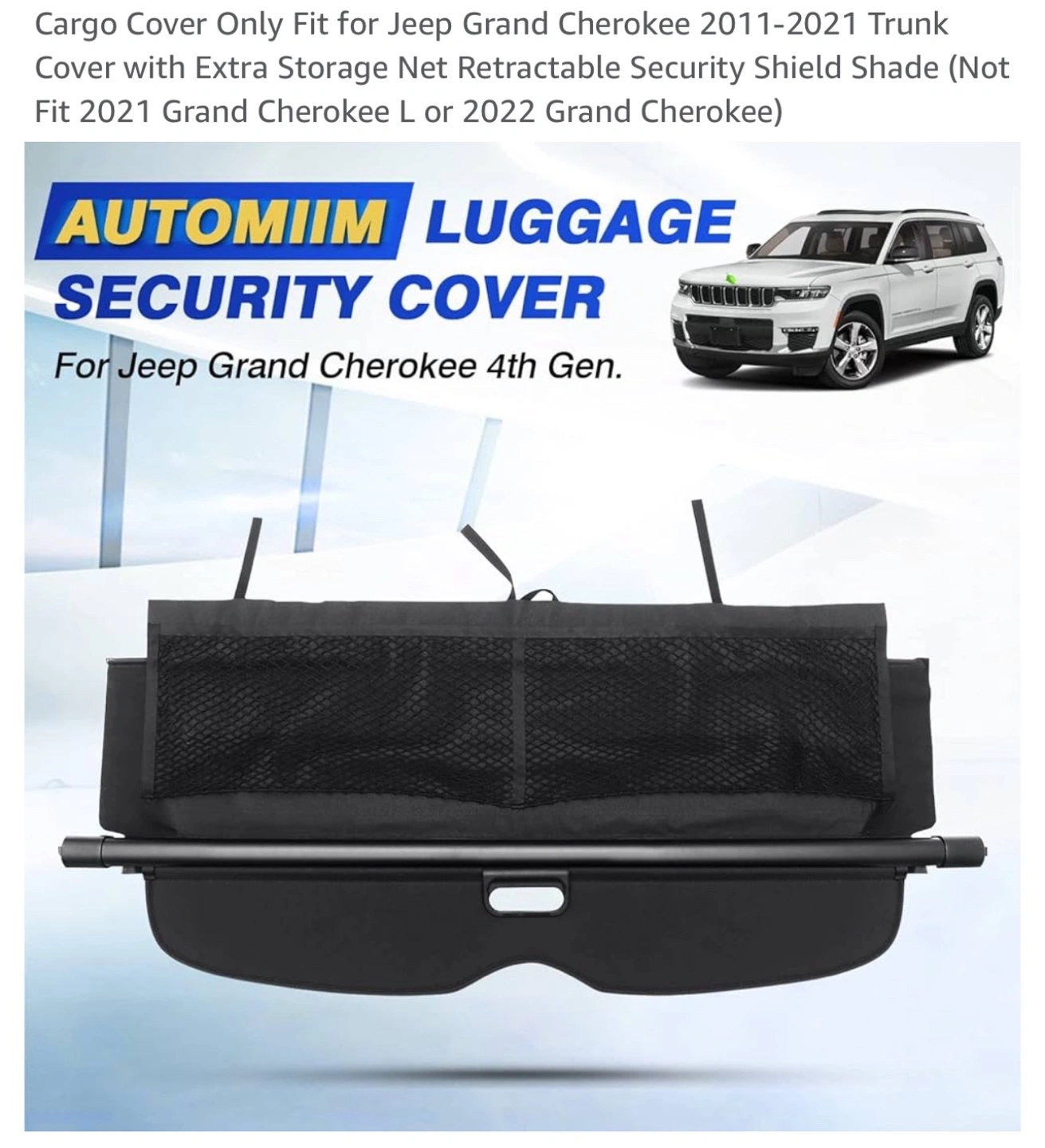 Cargo cover and floor mats for Jeep Grand Cherokee. Cargo cover includes a storage net. Floor mats are black and made of TPE.