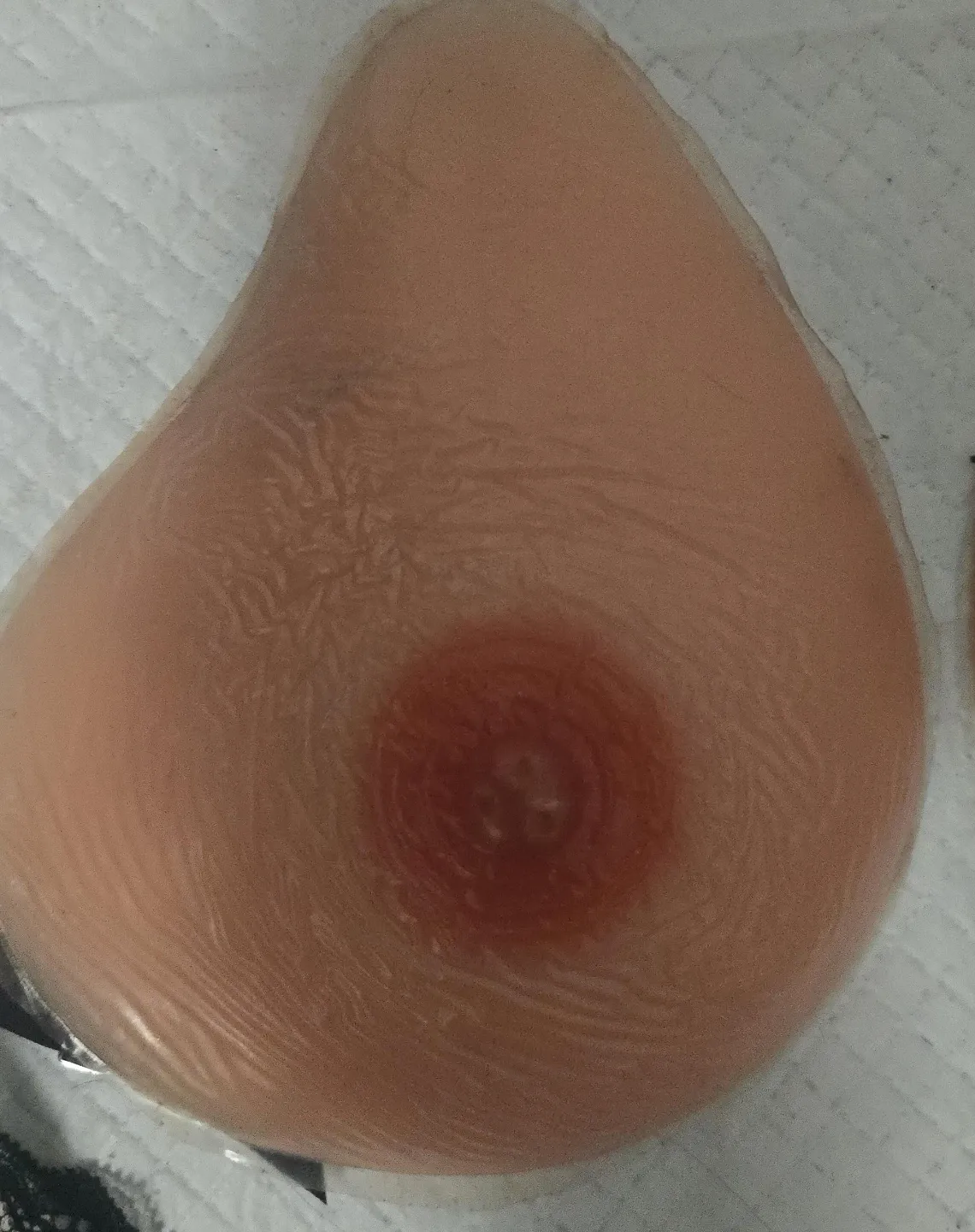 This is a silicone breast prosthesis designed for comfort and natural feel. It has a realistic nipple shape and is made from soft, skin-like silicone. It's suitable for post-surgery or cosmetic use.