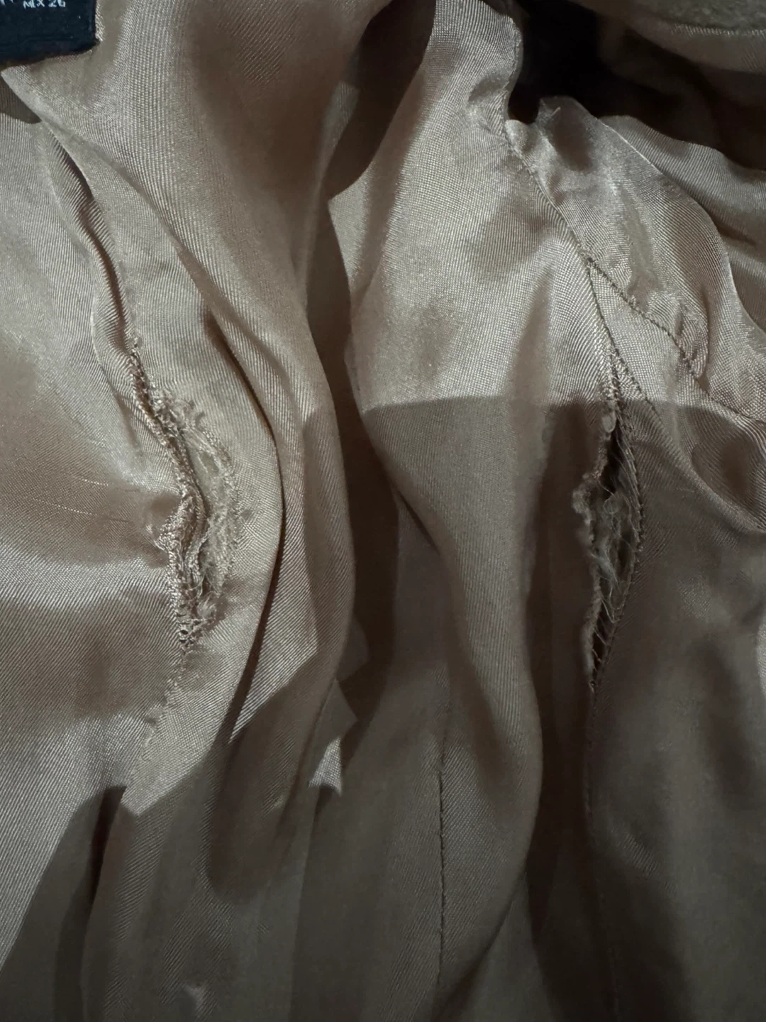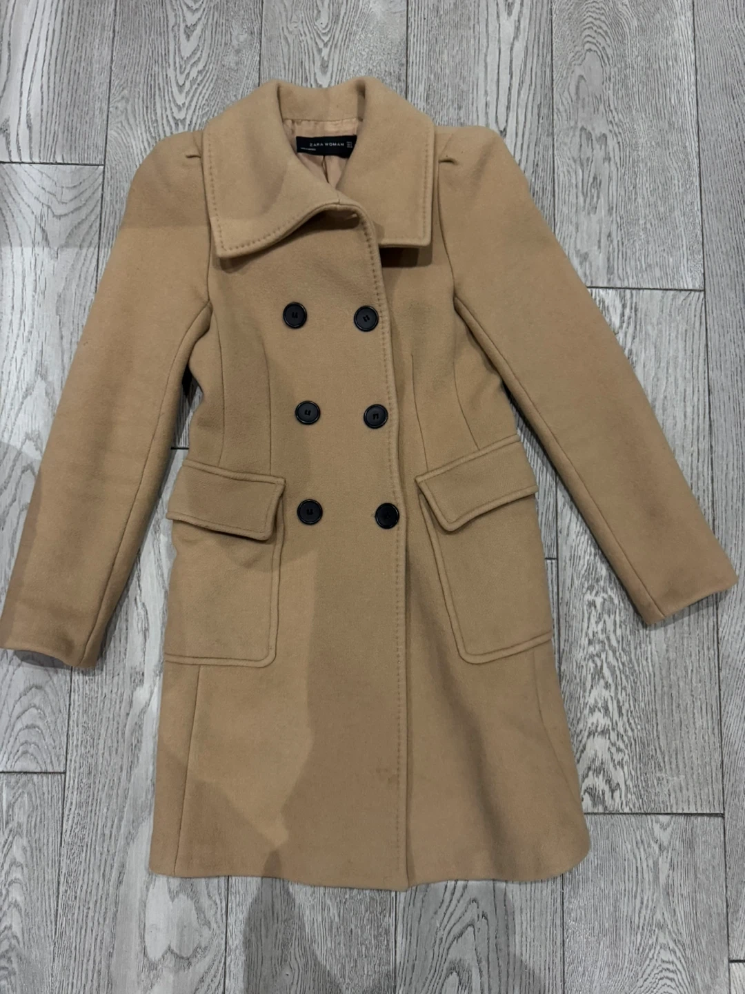 Classic camel double-breasted coat from Zara Woman. It's made with a wool blend and features four front buttons and two pockets. There's some wear visible on the interior lining.