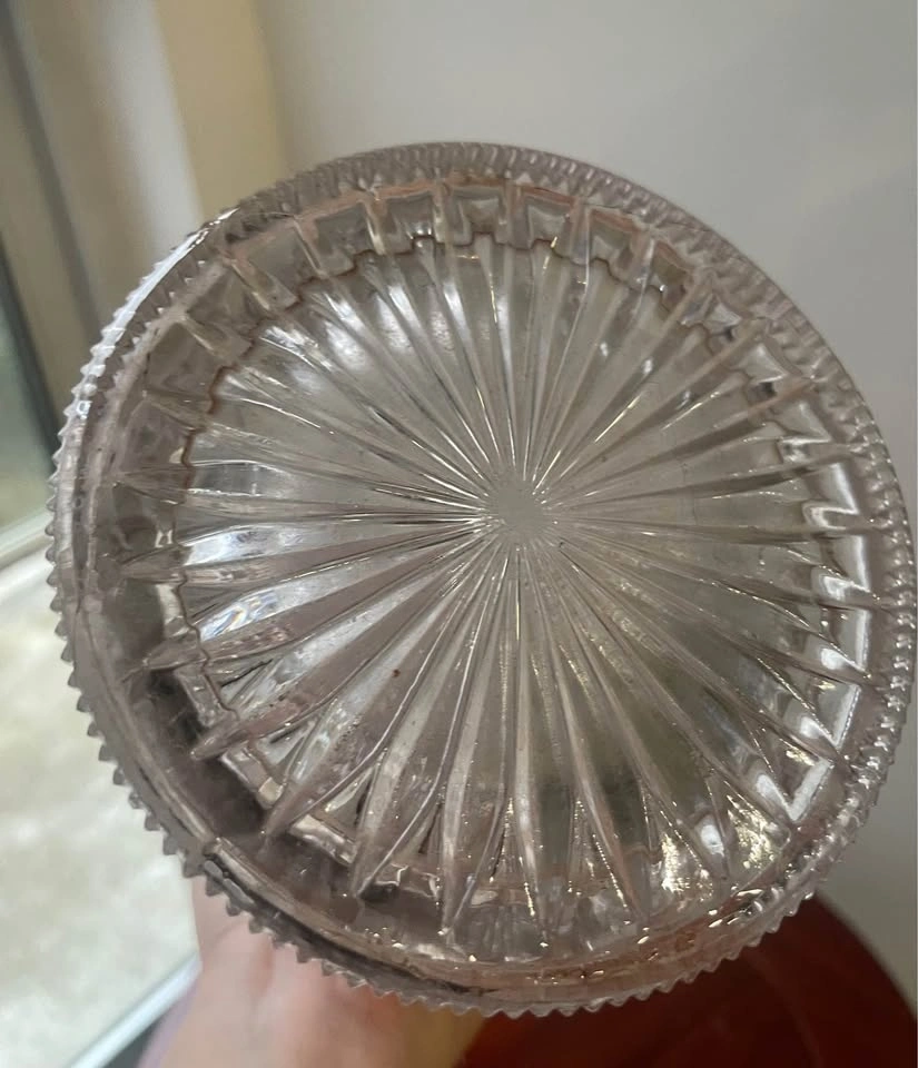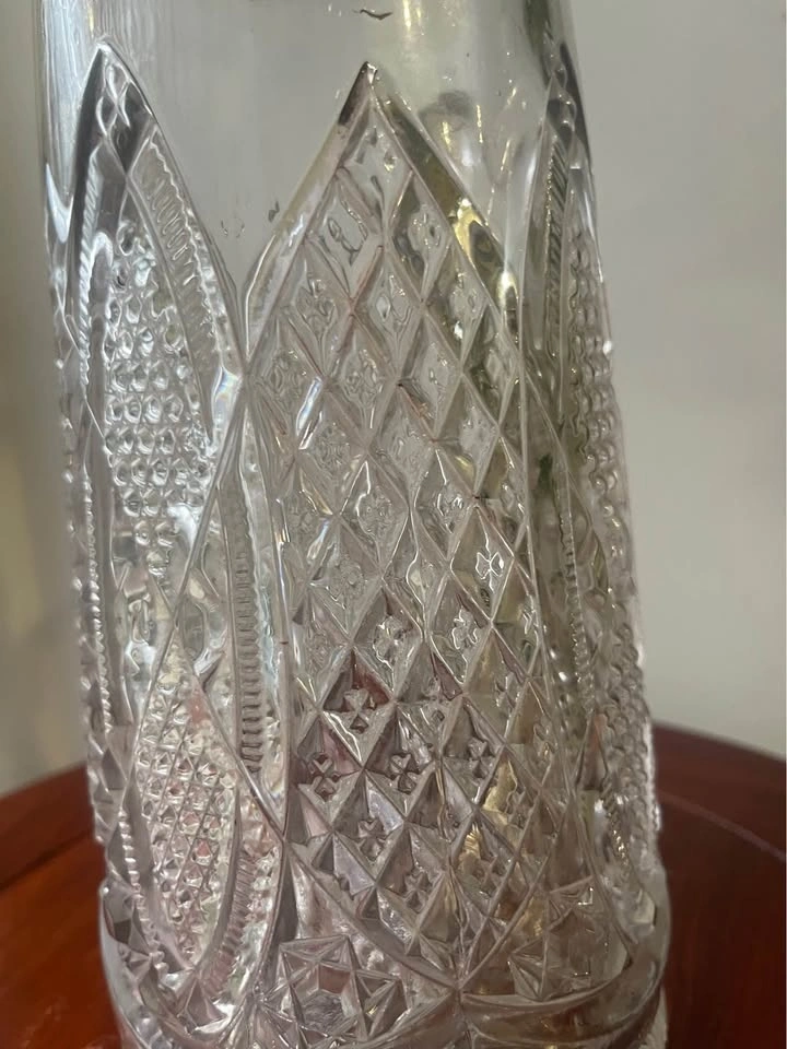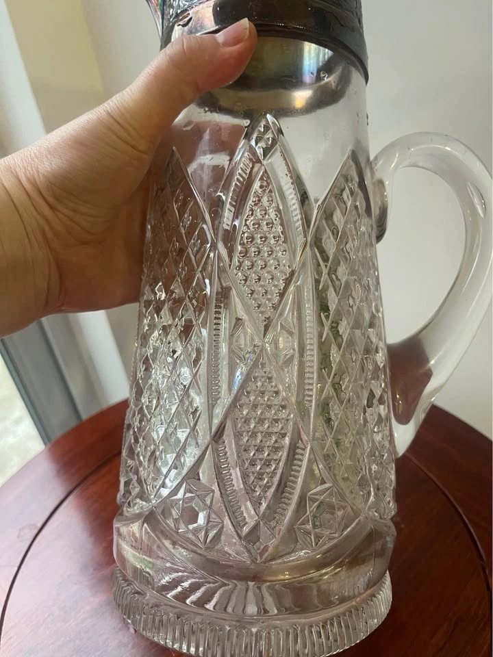 Beautiful vintage pitcher with an all-around cut glass design. Features an ornate silver plated metal top with a spout. Great for serving drinks or as a display piece.