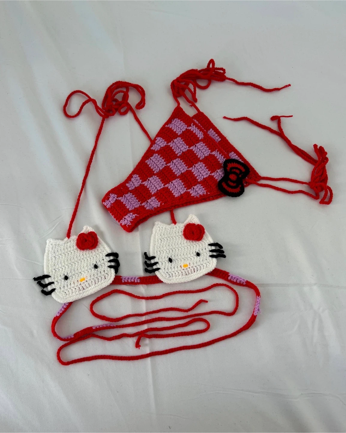Hand-crocheted bikini featuring Hello Kitty faces and a checkered pattern. It's made with yarn and has adjustable ties for a custom fit. This is a unique piece, perfect for festivals or a fun beach day!