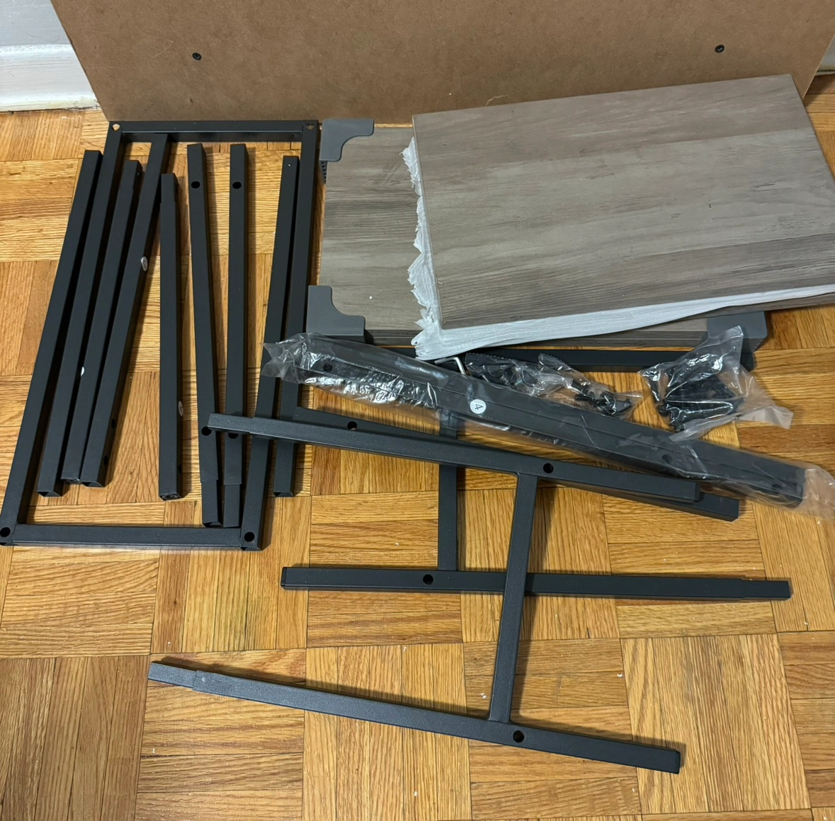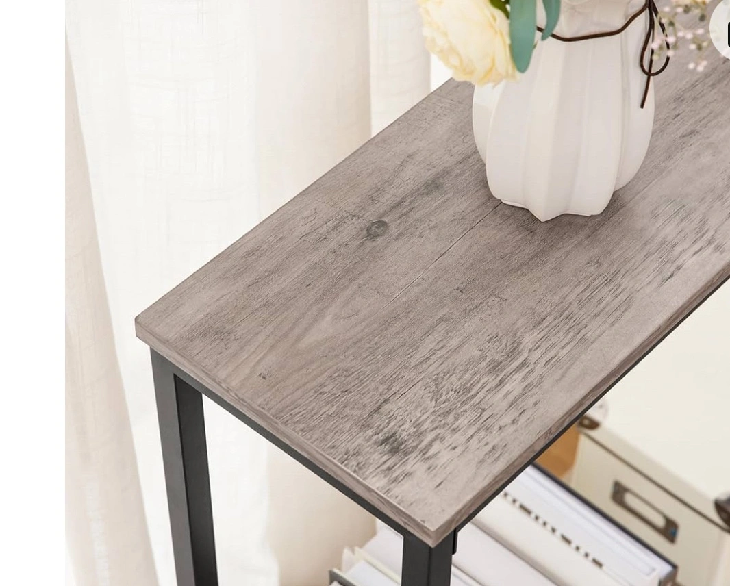 Console table with two shelves and a grey top and black frame. Quick to Assemble each part is clearly labeled and has a comprehensible instruction. This two tier console table takes up a little space and adds an aesthetic style at your home.