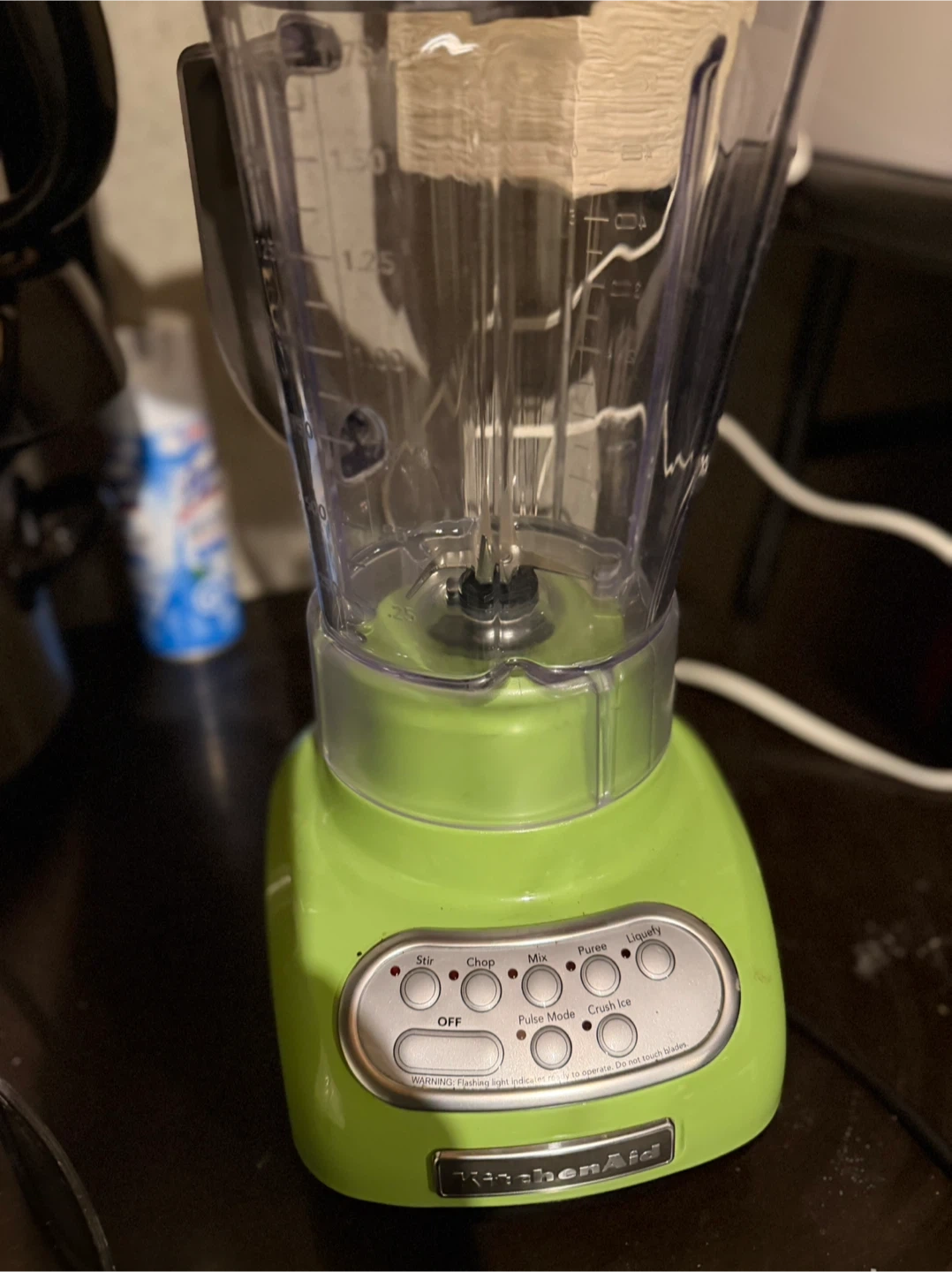 This is a green KitchenAid blender. It has multiple speed settings including Stir, Chop, Mix, Puree, and Liquefy. Pulse mode and Crush Ice functions are also available. The jar has measurement markings up to 1.5L.