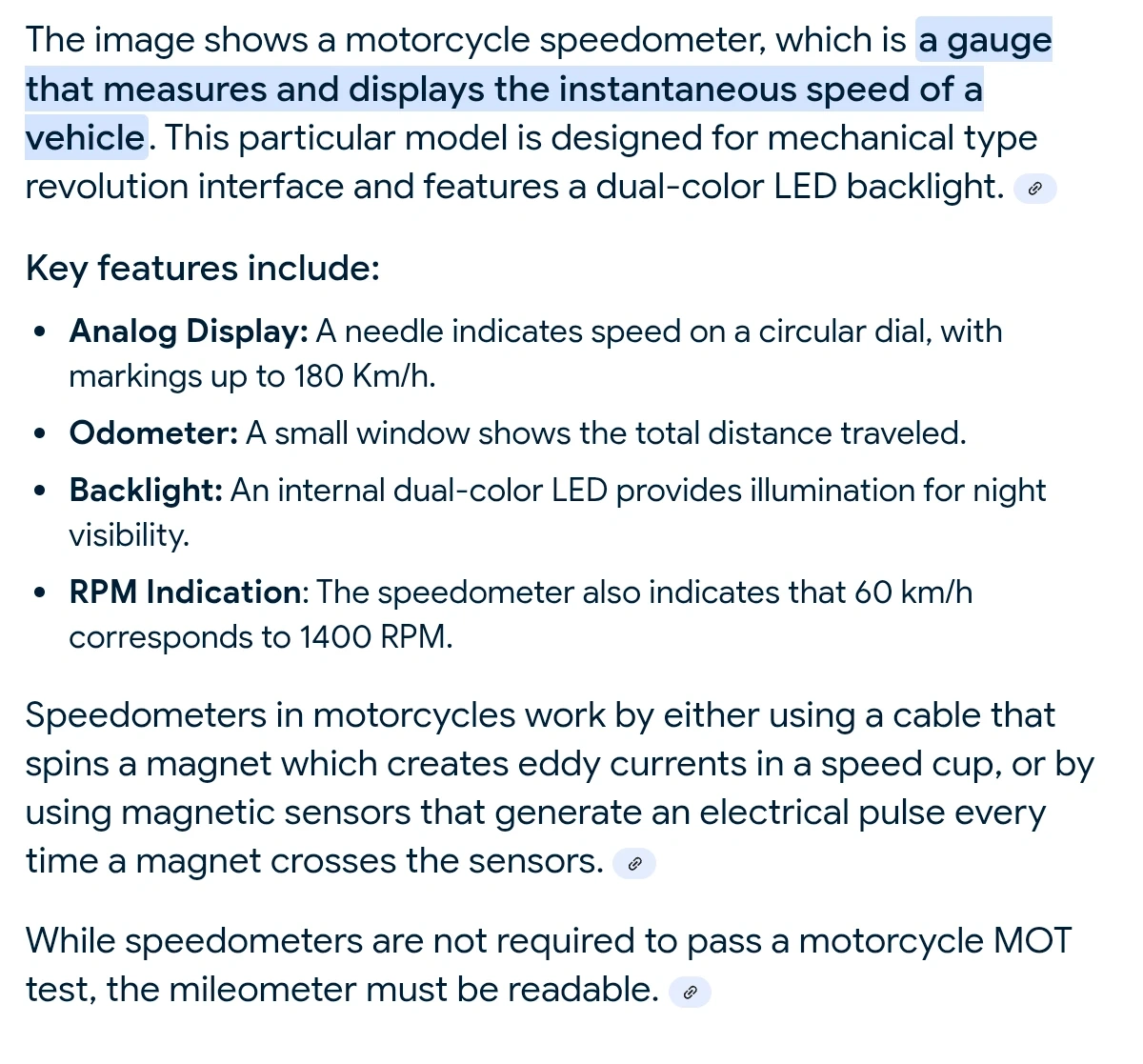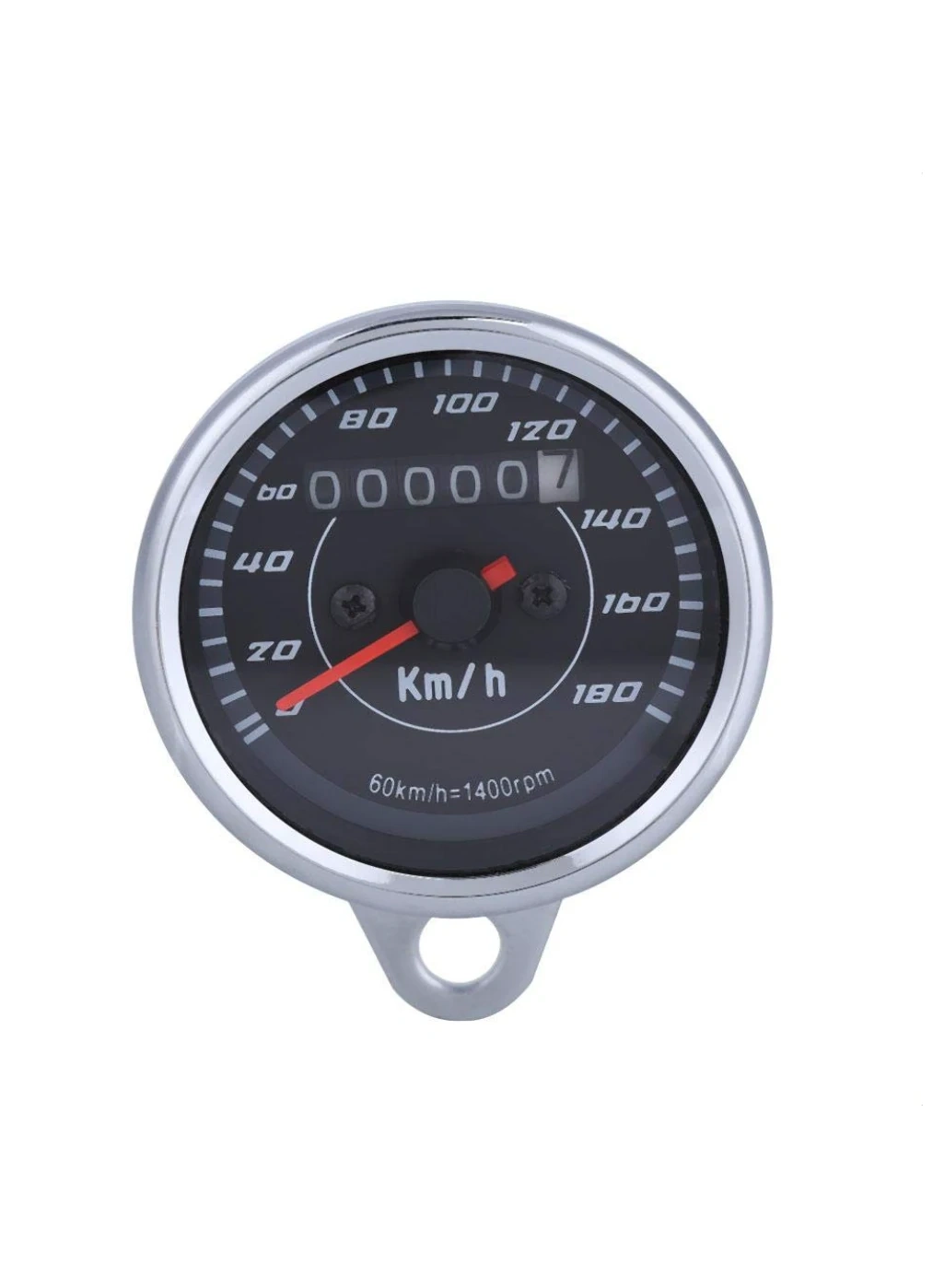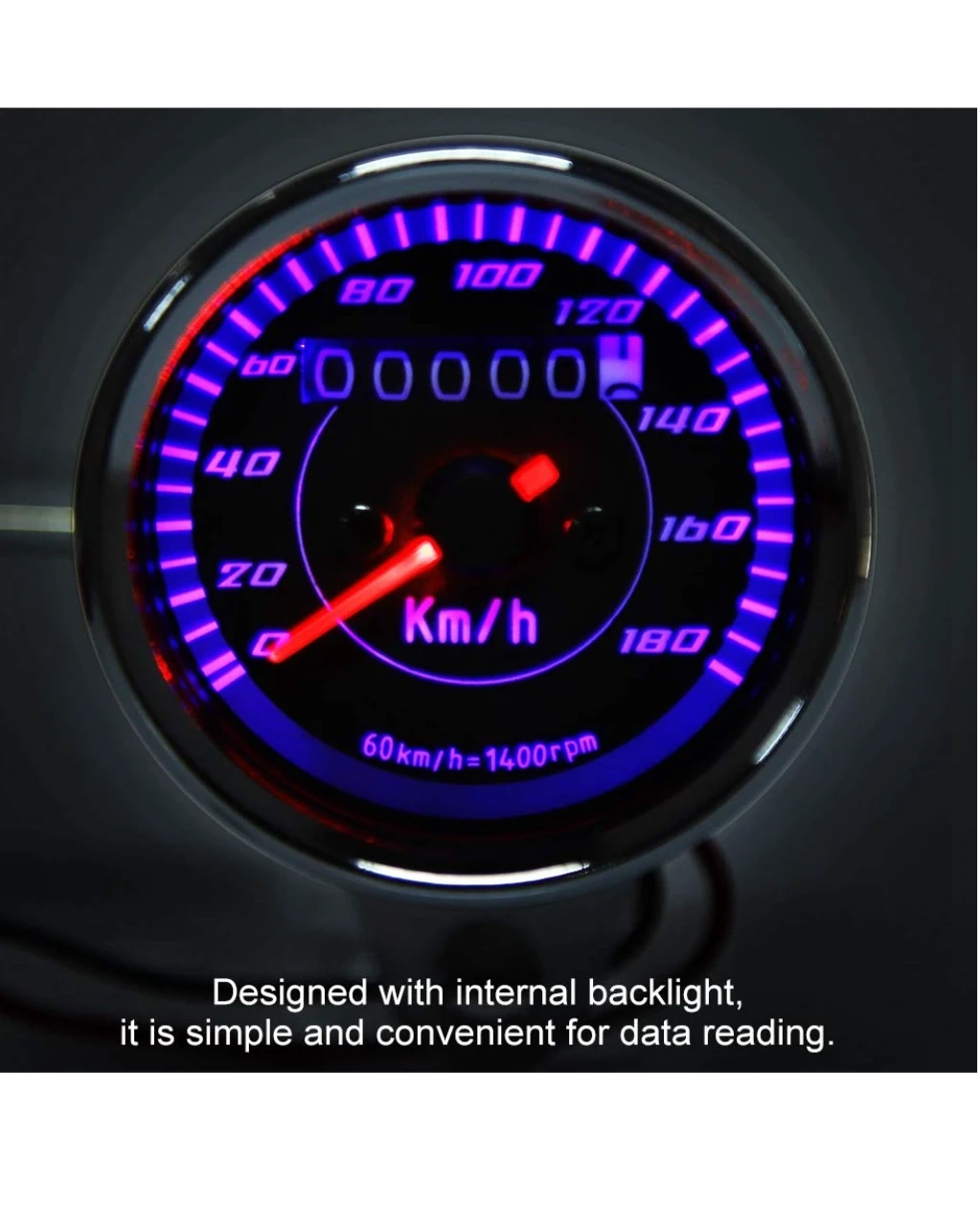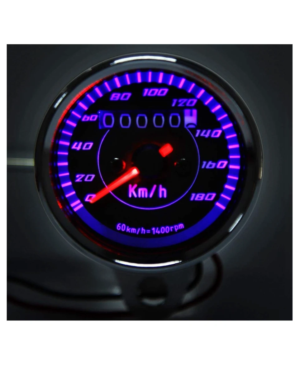 This is a universal motorcycle speedometer with an odometer. It features a backlit display for easy reading day or night. The unit reads in Km/h and includes a 60 km/h = 1400 rpm ratio.
