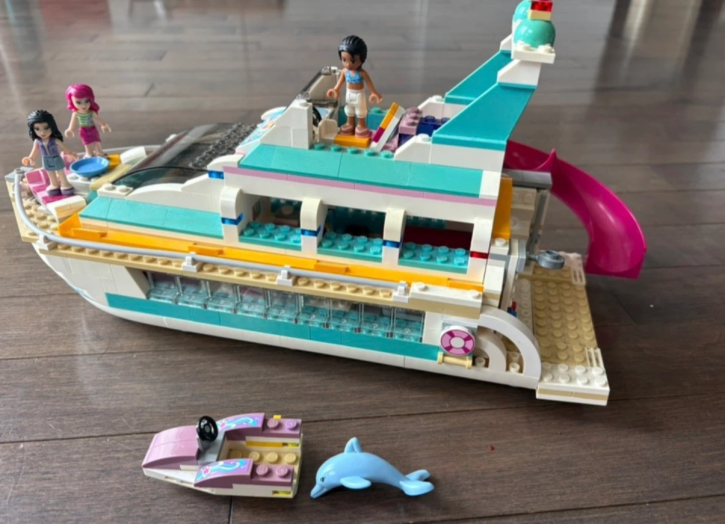 This LEGO Friends set features the Dolphin Cruiser, complete with mini-dolls and accessories. Includes figures and the boat with a slide. It's a fun building toy for creative play. Pieces are made of plastic.