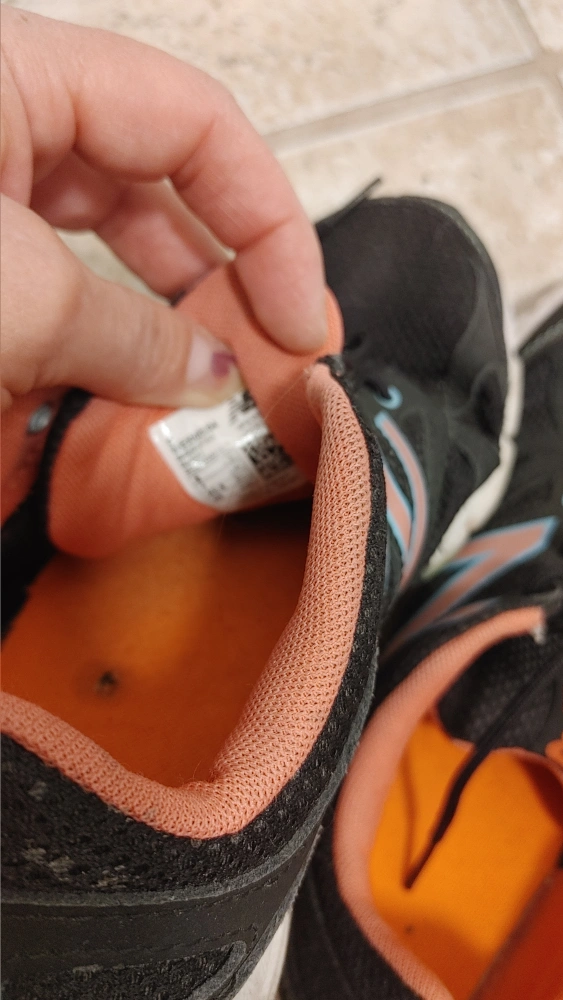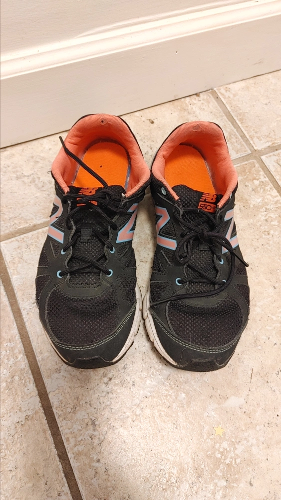 These are black Balance running shoes with coral and light blue accents. They have mesh uppers and rubber soles. Great for your daily jogs or workouts!