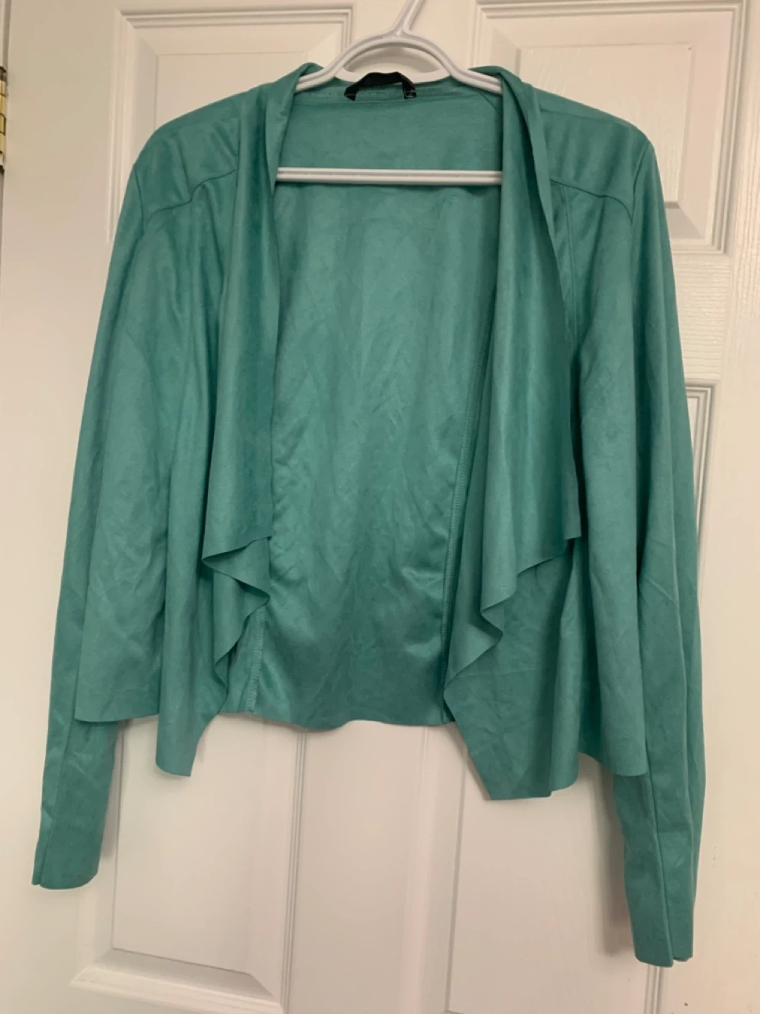 This is a teal waterfall cardigan from Shein. It's a size medium with an open front design. The material feels soft and drapes nicely.