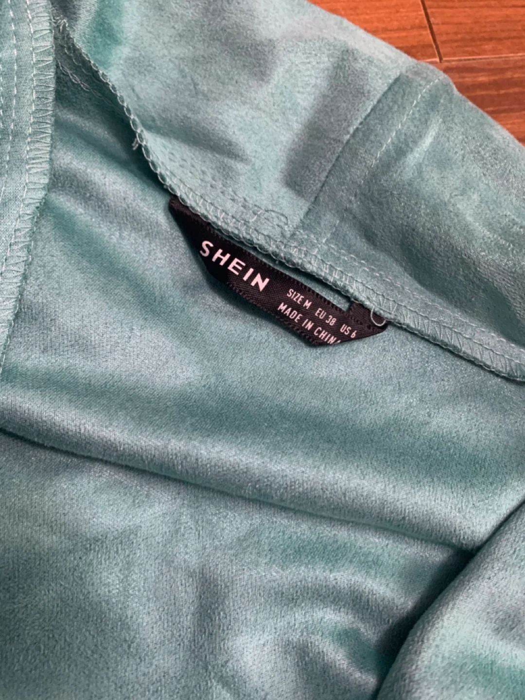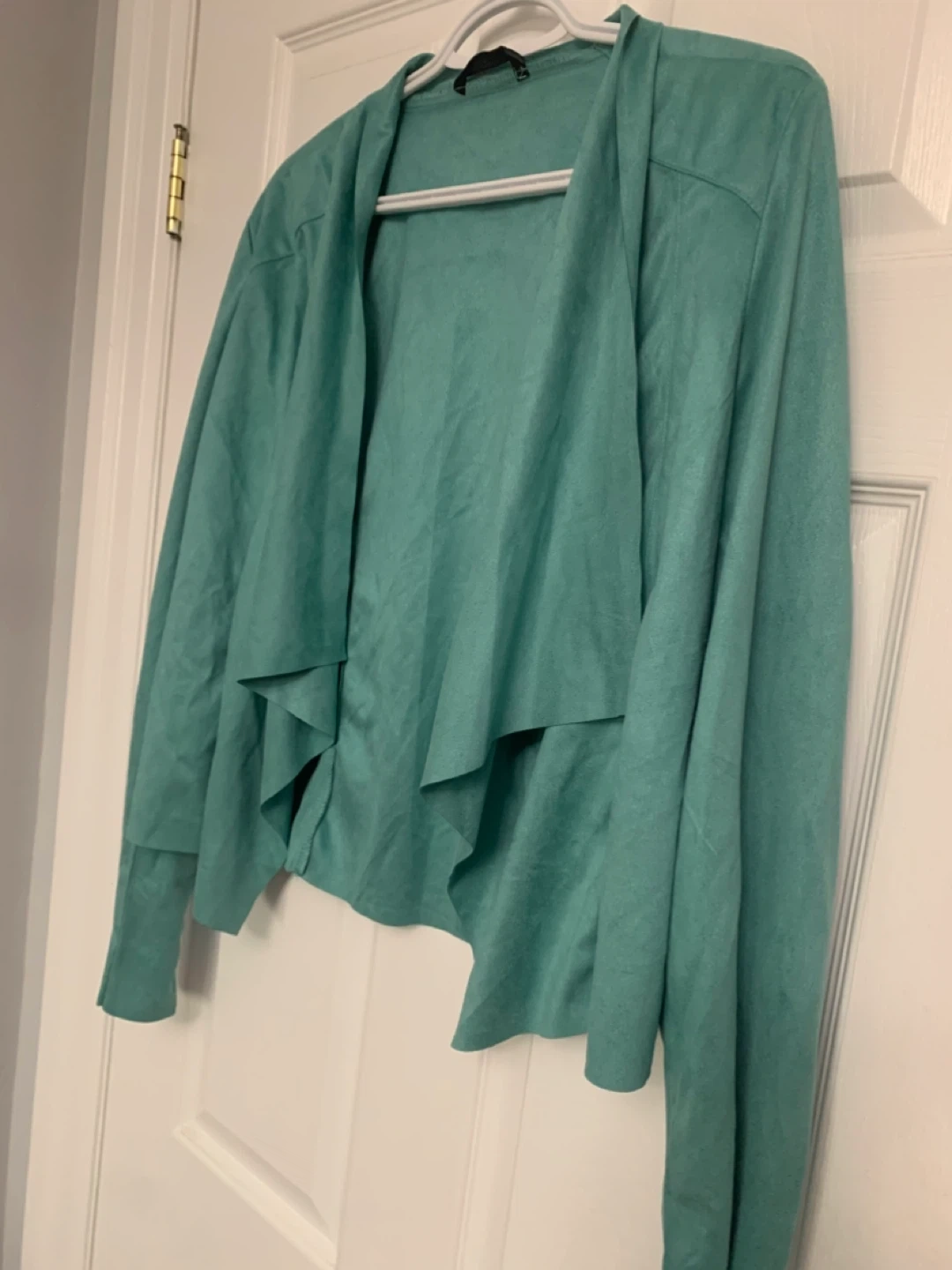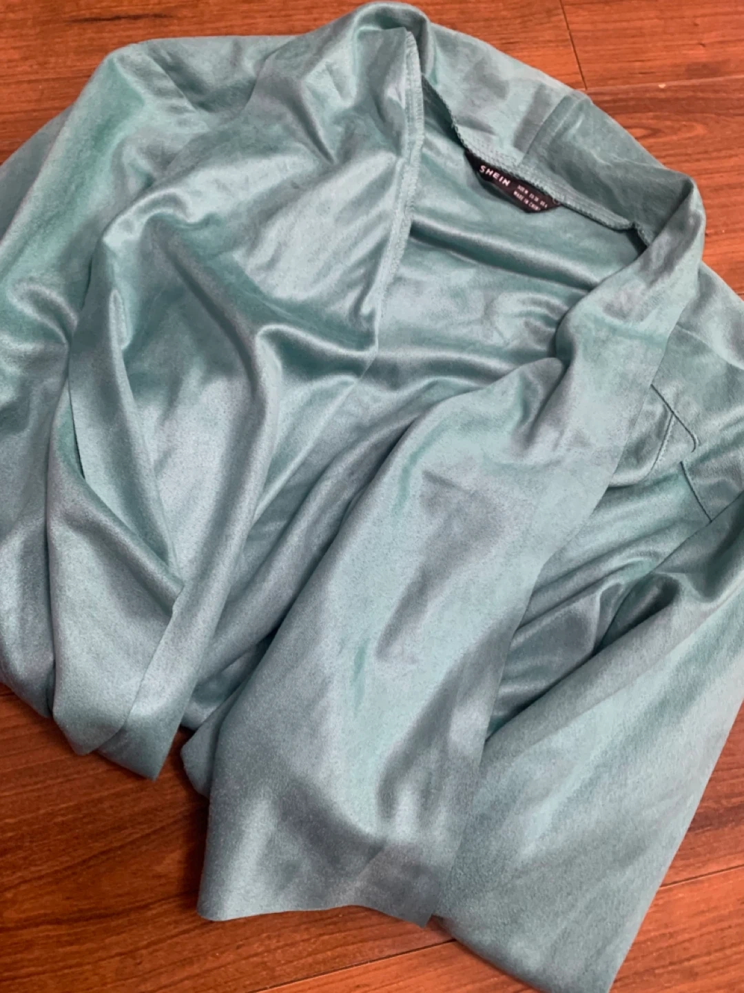 This is a teal waterfall cardigan from Shein. It's a size medium with an open front design. The material feels soft and drapes nicely.