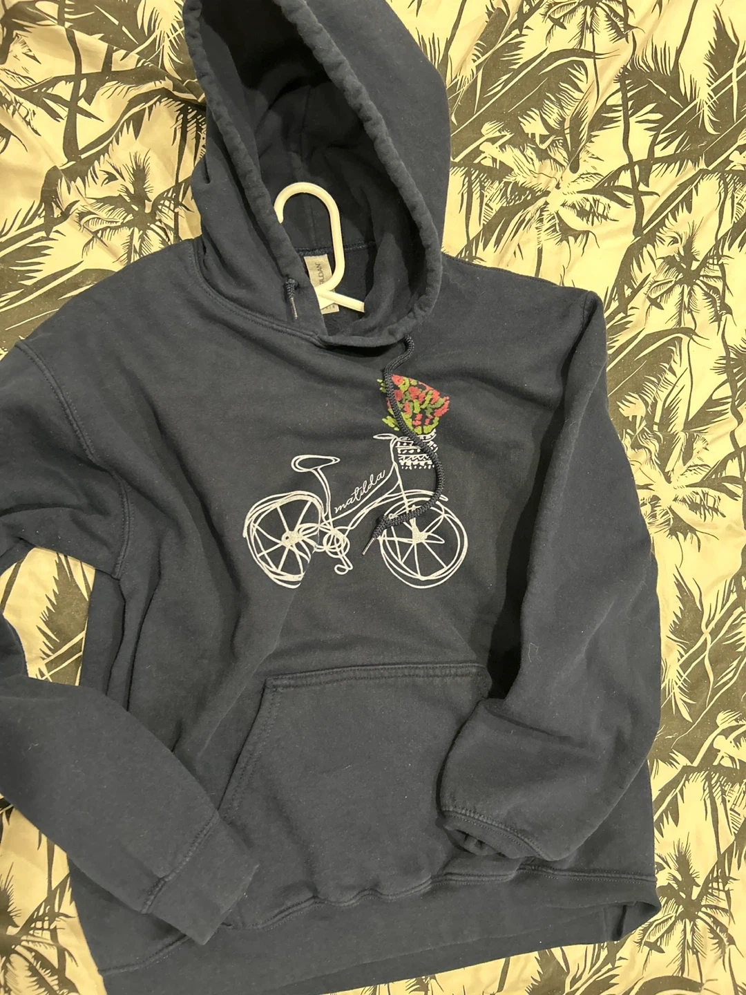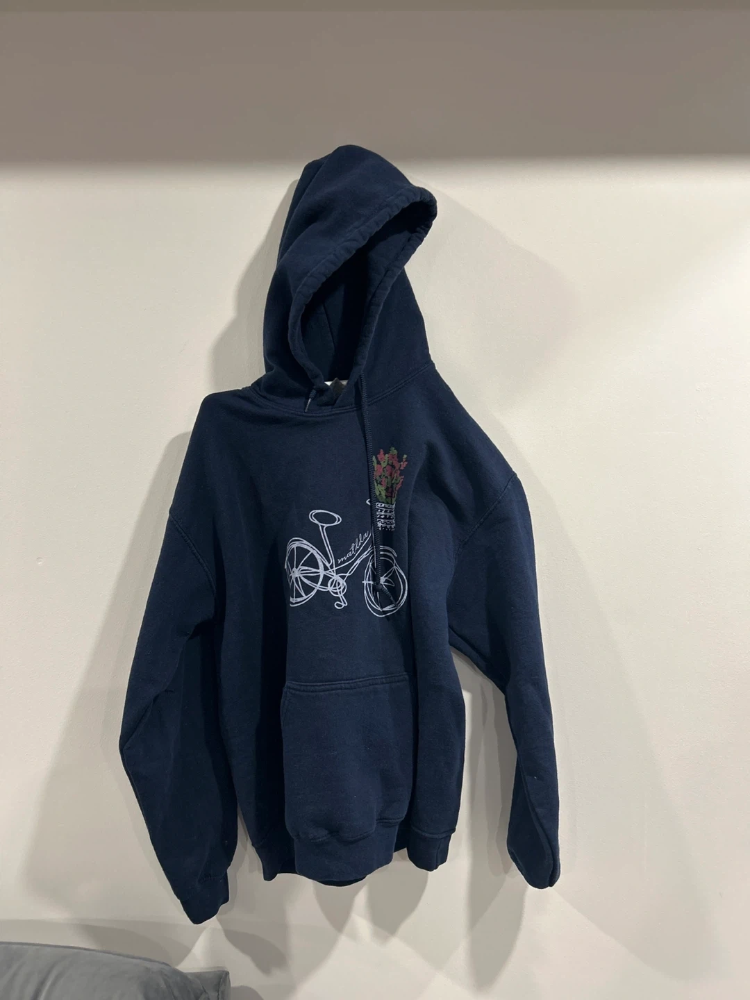 This is a dark blue hoodie with a graphic design of a bicycle and flowers on the front. It's a comfortable and stylish piece for everyday wear. Made from a soft cotton blend.