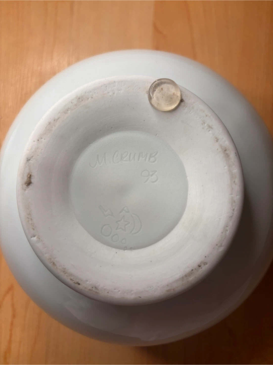 Signed and dated Michael Crumb, 1993 on the base. Crafted as studio pottery, hand made. The lid features a sculpted bunny finial that adds to its charm.