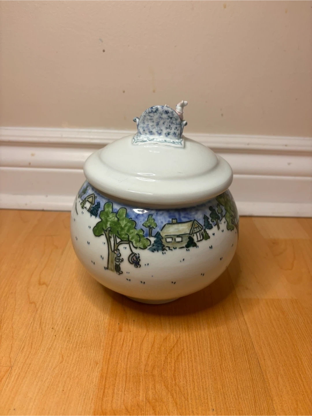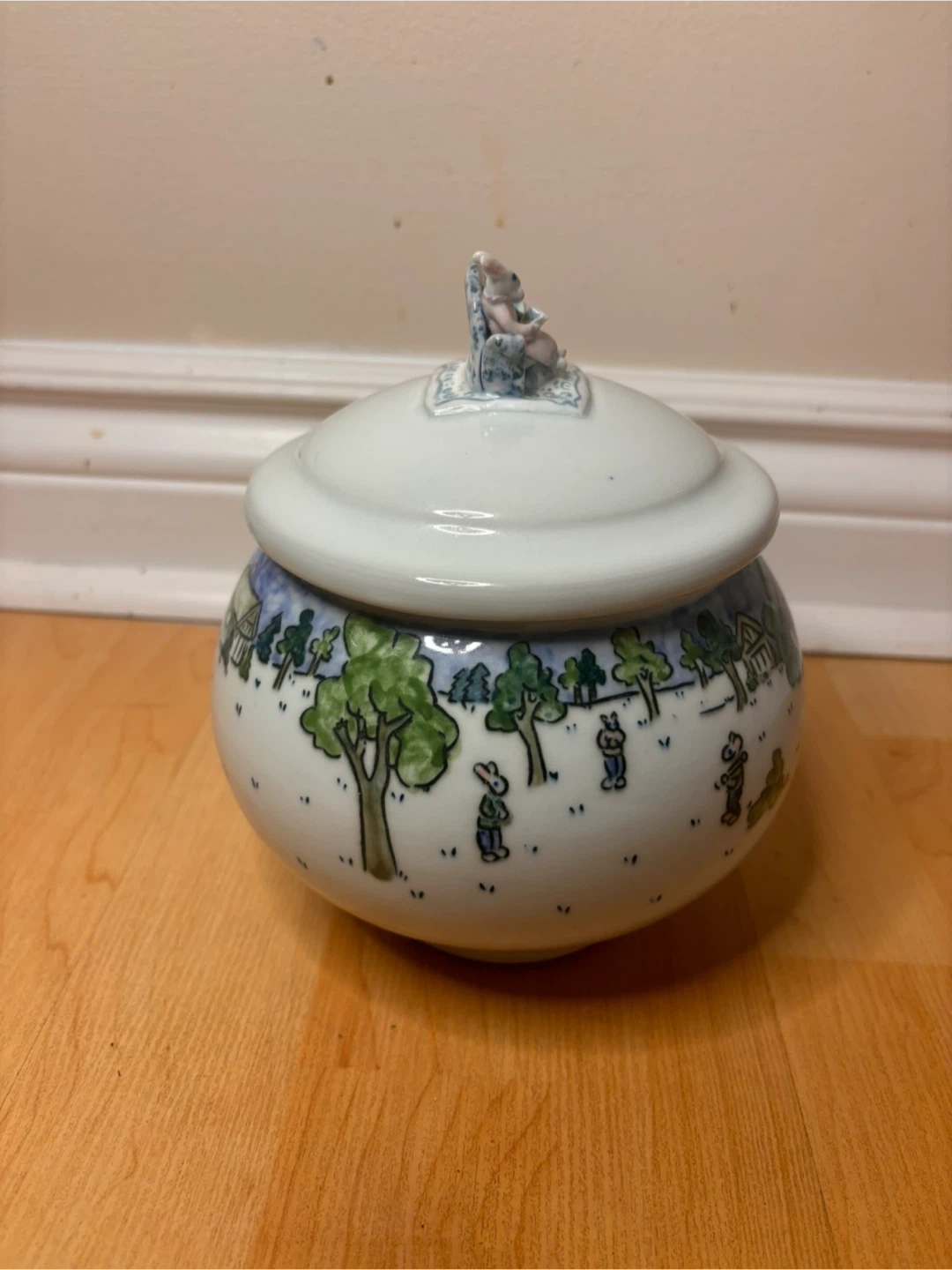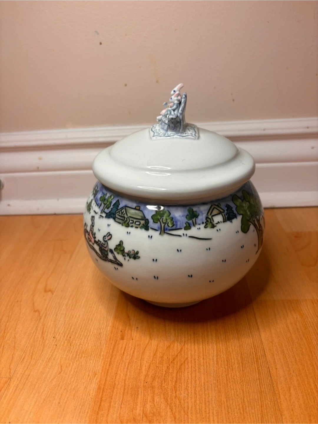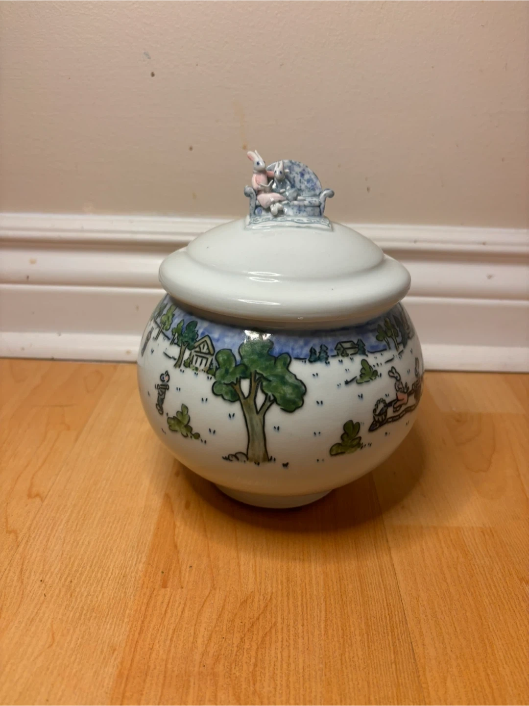 $100 or best offer - Hand-painted ceramic lidded pot featuring a sweet parent and baby bunny rabbit scene, surrounded by a whimsical countryside motif. This piece would make a beautiful decorative accent or keepsake piece.
