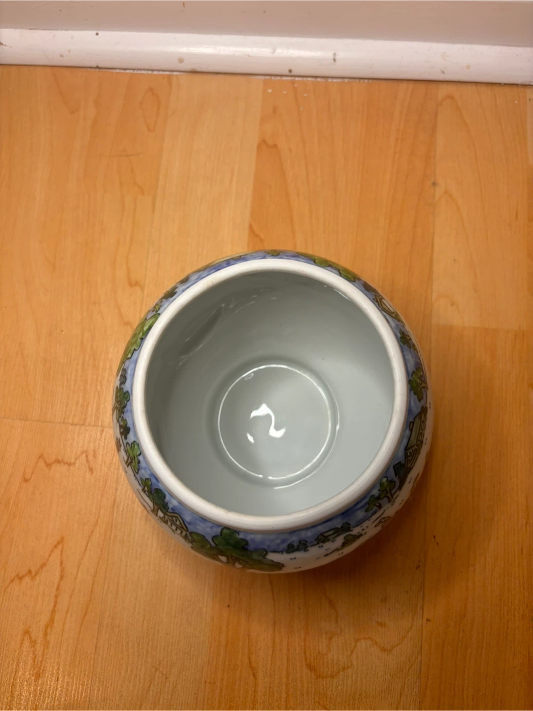 $100 or best offer - Hand-painted ceramic lidded pot featuring a sweet parent and baby bunny rabbit scene, surrounded by a whimsical countryside motif. This piece would make a beautiful decorative accent or keepsake piece.
