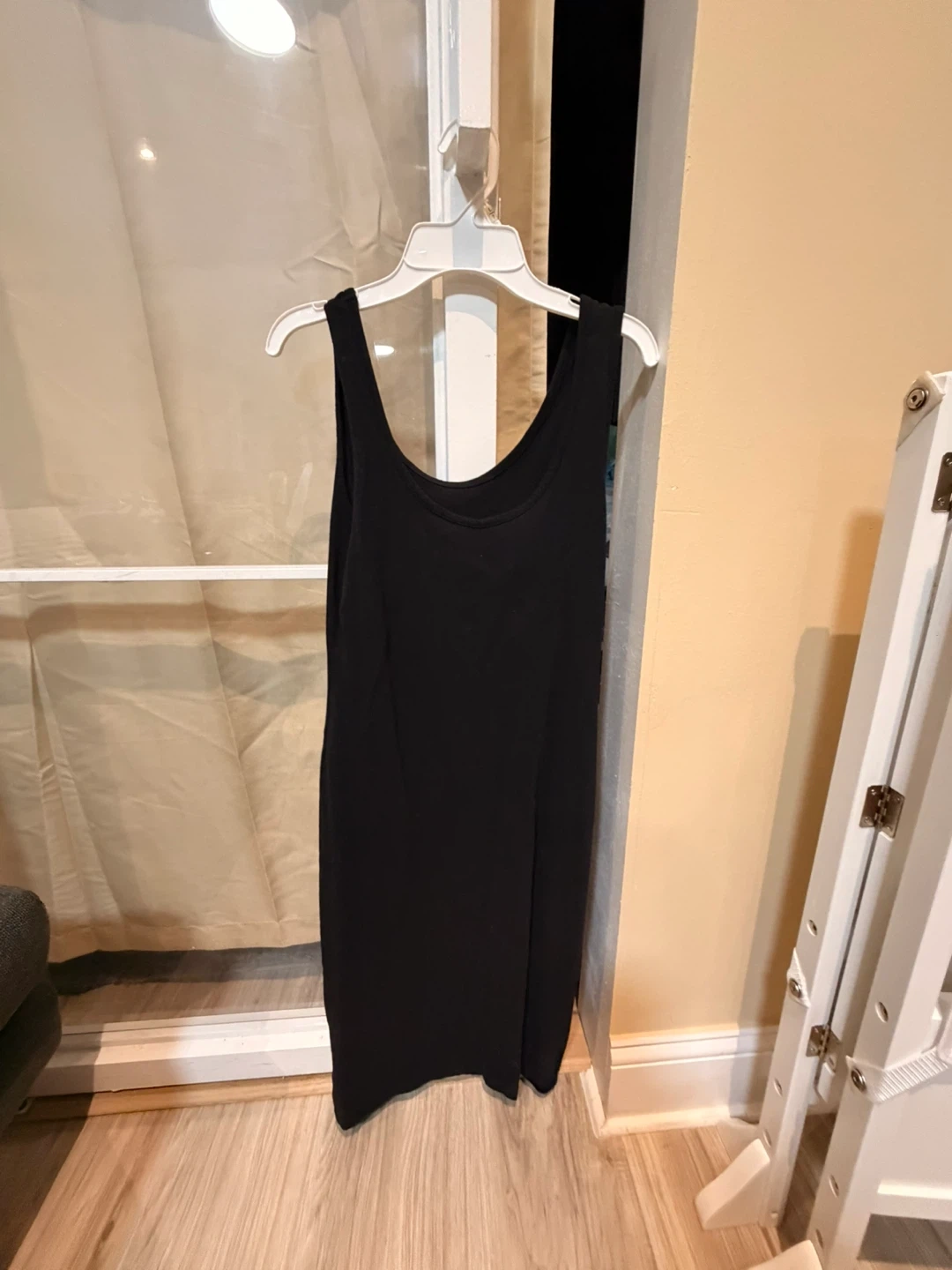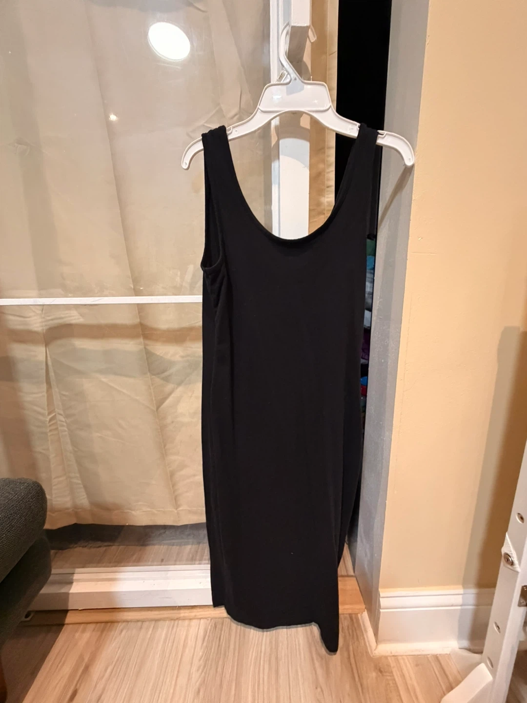 This is a simple black tank dress. It's a basic silhouette suitable for layering or wearing on its own. The material feels soft and stretchy.