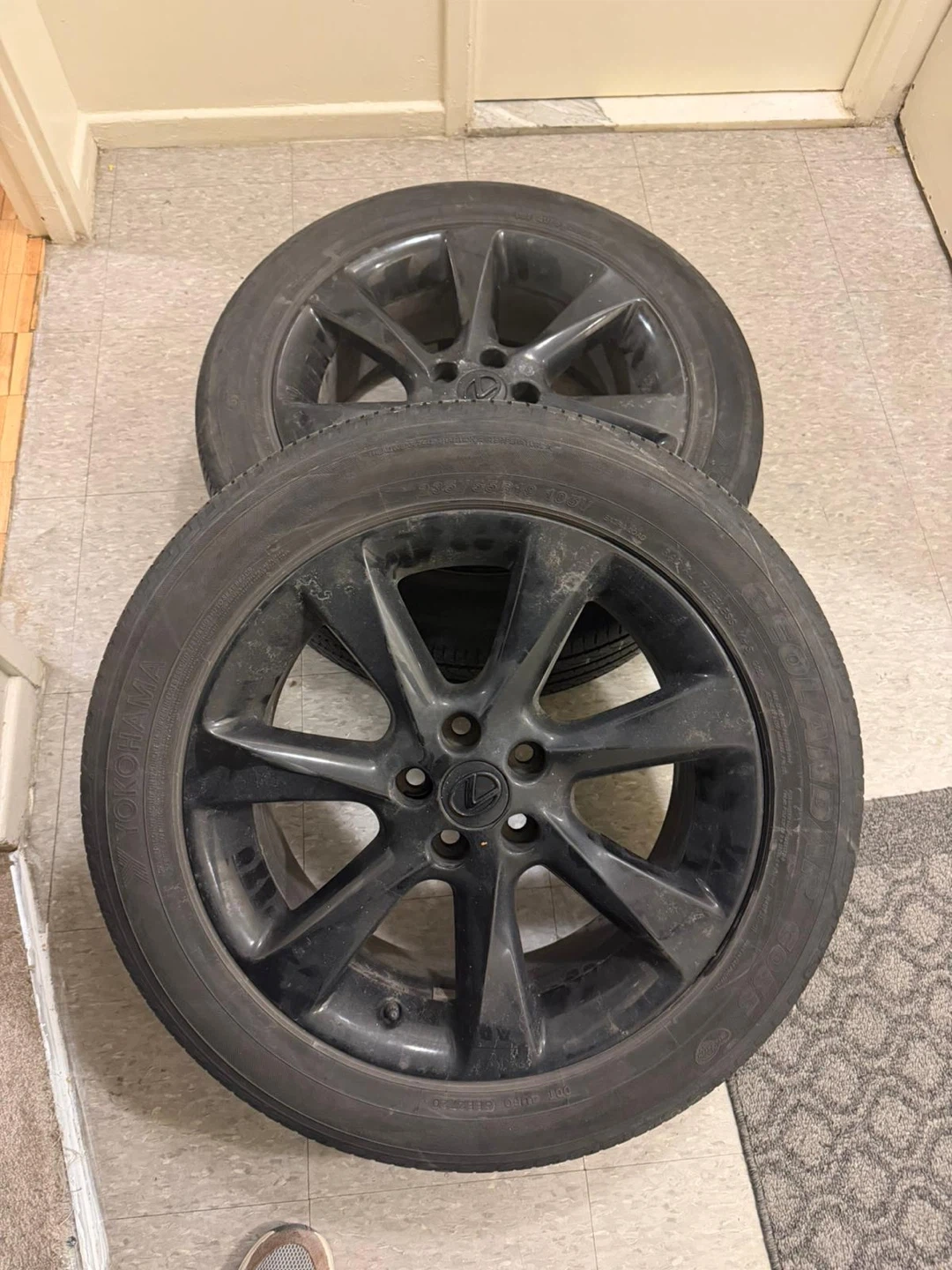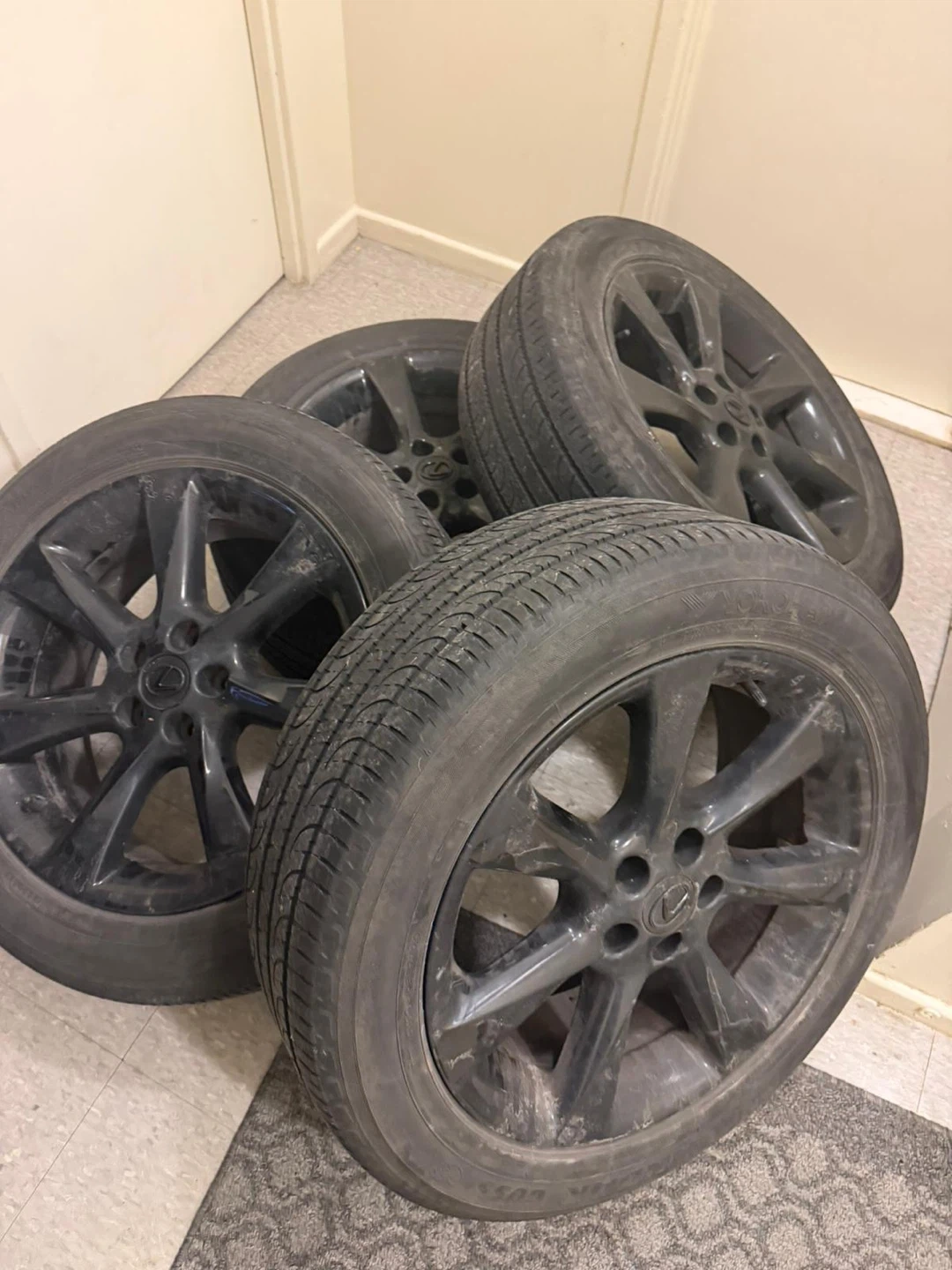Set of four used alloy wheels with tires. These came off a Lexus vehicle. All four wheels are black and have a Lexus logo in the centre. They're good for replacing damaged wheels or for a winter tire setup.