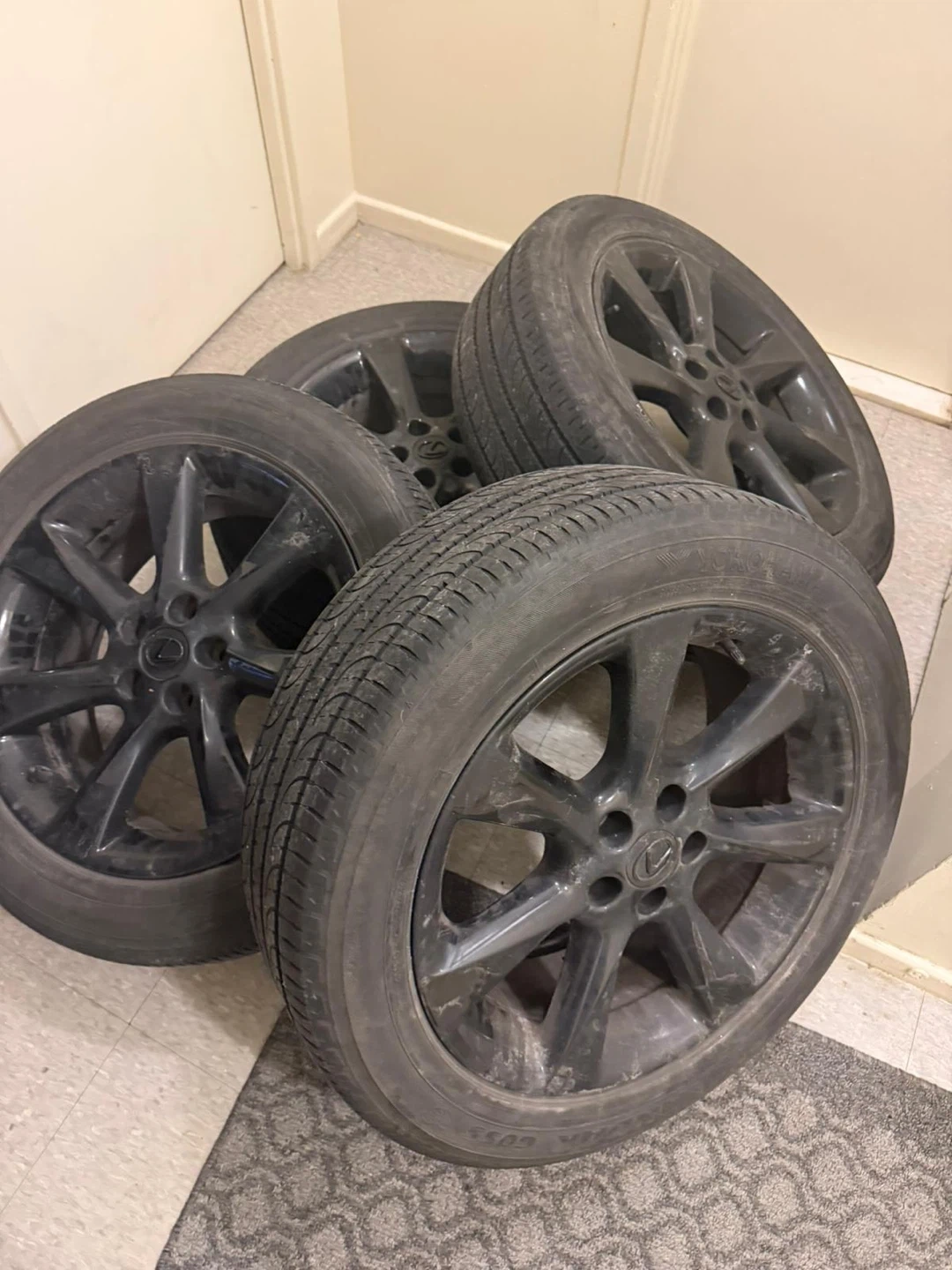 Set of four used alloy wheels with tires. These came off a Lexus vehicle. All four wheels are black and have a Lexus logo in the centre. They're good for replacing damaged wheels or for a winter tire setup.